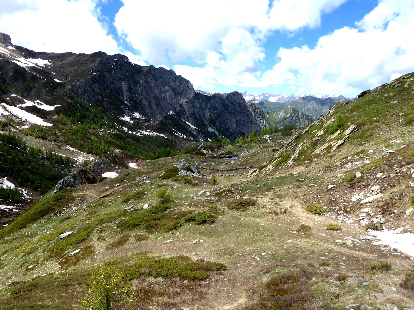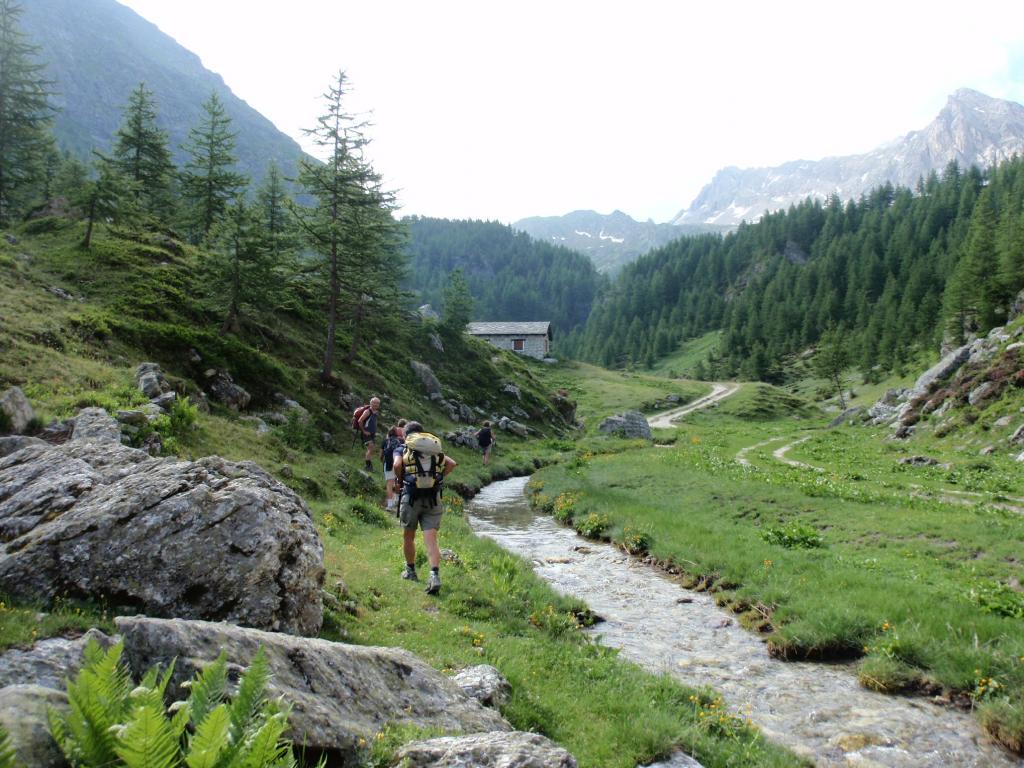Si continua senza possibilità di errori a seguire la strada e lasciata a sinistra la diramazione verso le Grange Chiacarloso (accesso alla strada chiuso con catena) si prosegue sino a quota 2160 in corrispondenza di una baita dove la strada ha termine. Si lascia a destra il sentiero poco visibile ,in questo tratto, del Tour della Meja e passando accanto alla baita si scende brevemente sino a guadare il Rio della Valletta.