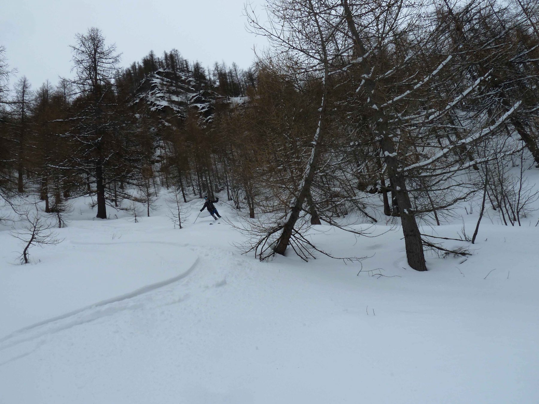 Giunti alle grange m.2160 abbiamo tentato di raggiungere il vallone che porta al passo della Valletta ma dopo un centinaio di metri in salita la ripidezza dei pendii e la notevole quantità di neve oltre al fatto di trovarci su un pendio sottovento ci hanno fatto desistere.Abbiamo così raggiunto il colle m.2560 e da qui causa vento abbastanza fastidioso abbiamo optato per la discesa tenendoci sulla dx dove abbiamo trovato dei bei pendii in crosta portante che precedentemente Eolo aveva liberato dalla neve recente.Giunti alle G. della Valletta m.2071 ripello per raggiungere la quota m. 2409 e riscesi dallo stesso versante su croste portanti fino al limite del bosco dove ci ha accompagnato una bella farina fino a Preit.