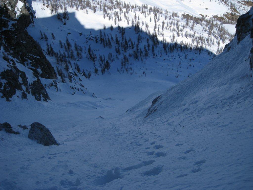 Risalire il conoide e proseguire lungo la cengia / valletta sospesa a metà della parete. Tratto esteticamente interessante.