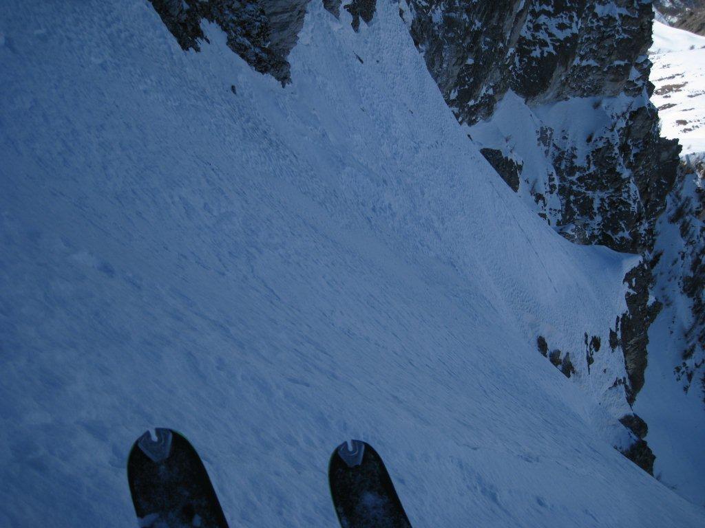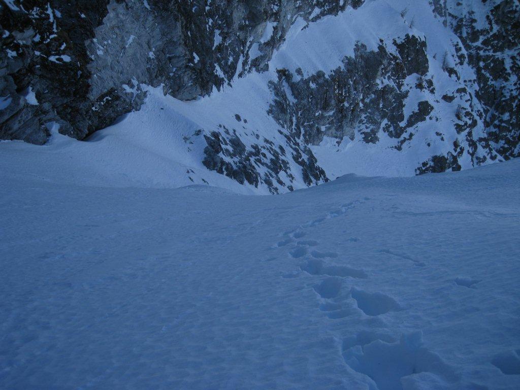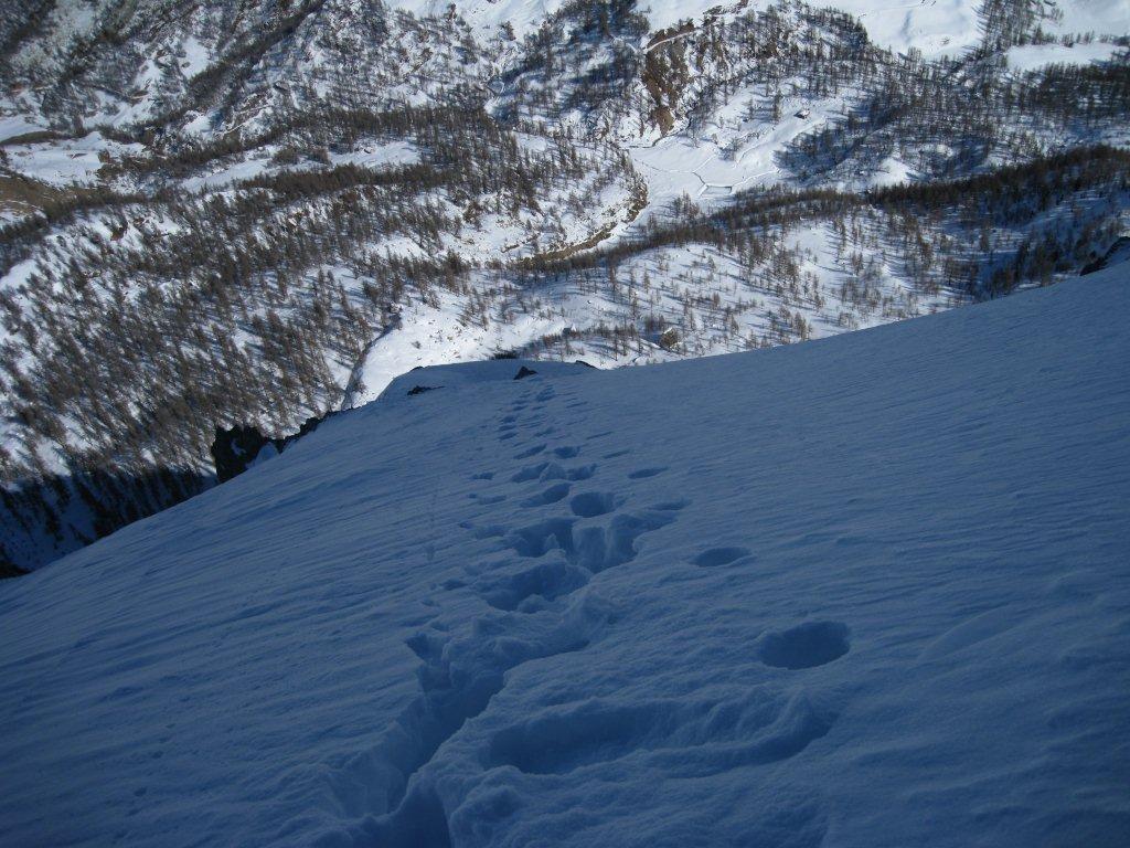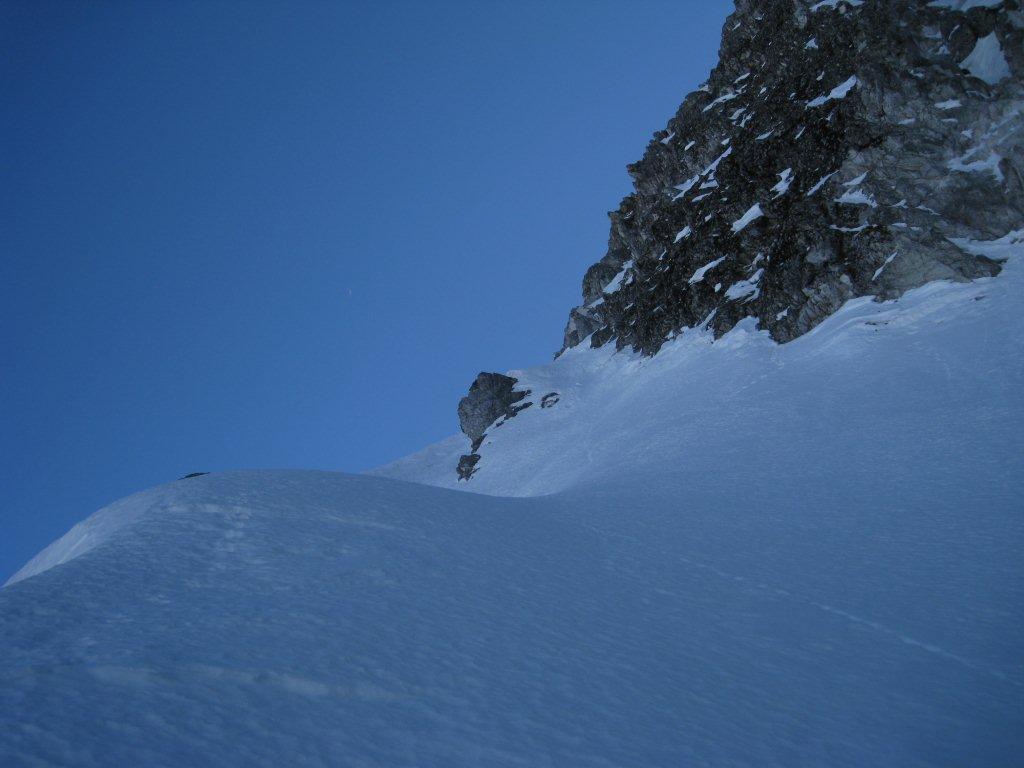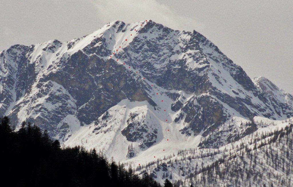Giunti al termine della stessa proseguire subito su di uno stretto costolone innevato che immette nel pendio/canale superiore, risalirlo con andamento ascendente da sinistra a destra (prestare attenzione in questo tratto ad eventuali lastroni da vento molto probabili) fino alla croce – molto artigianale –posta in vetta.
