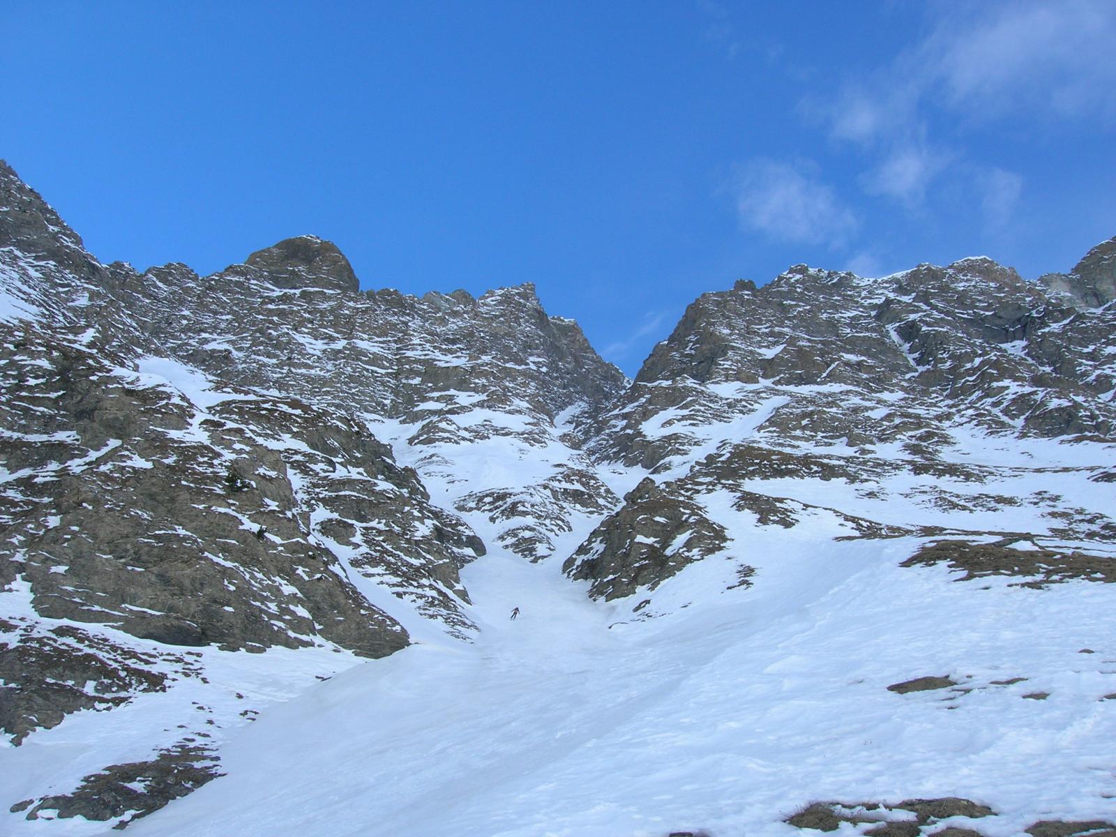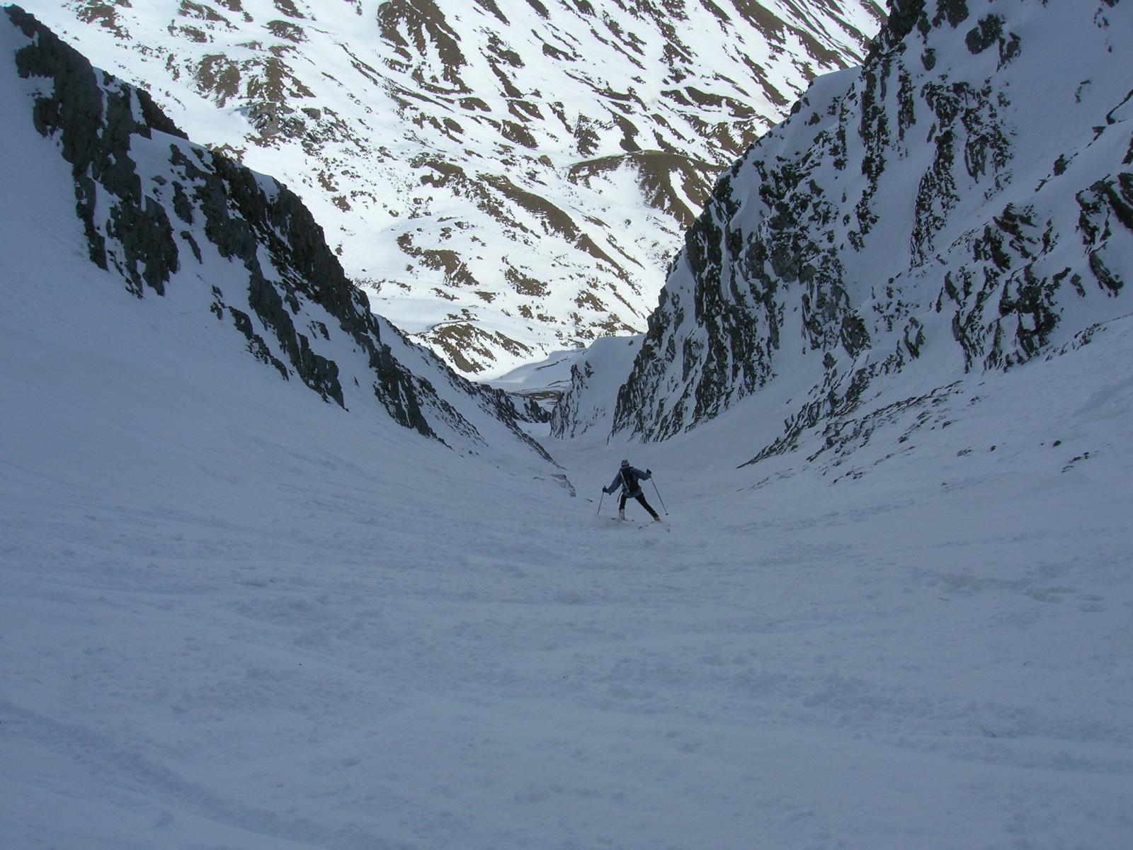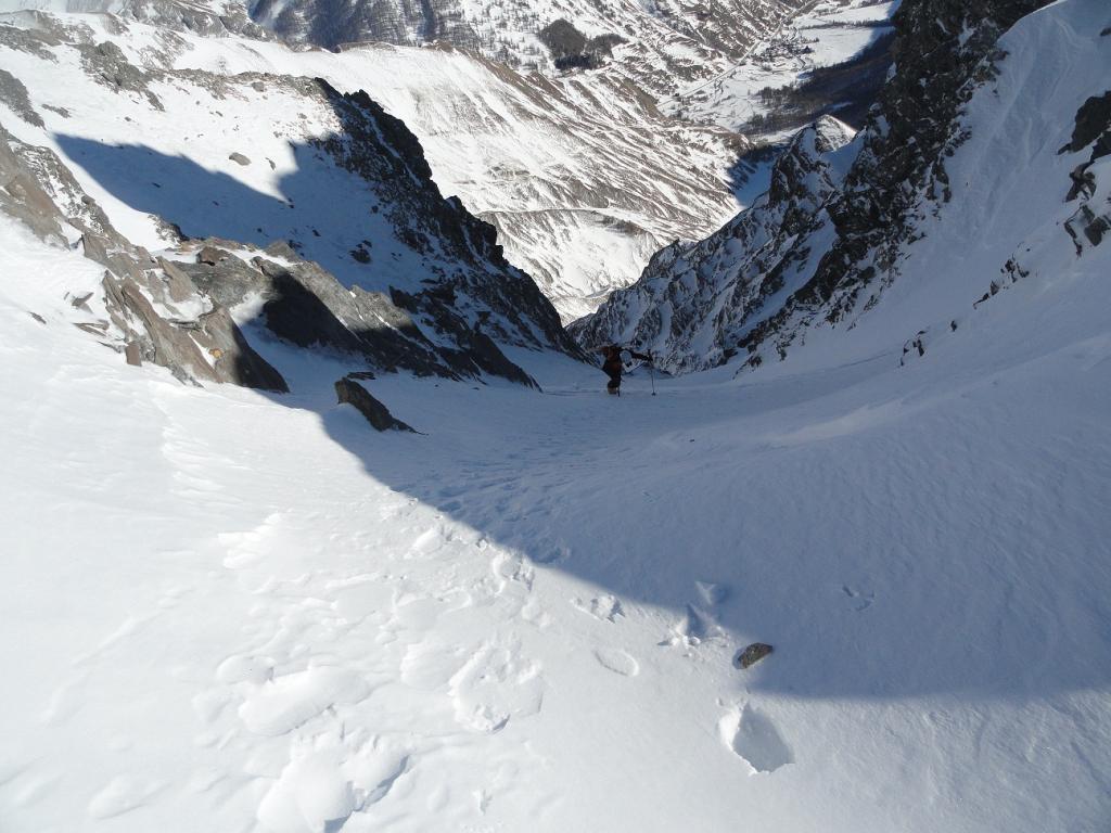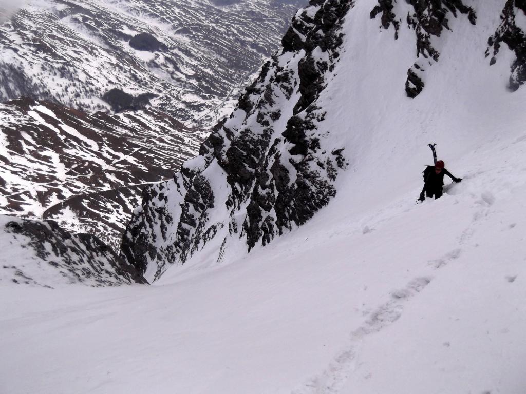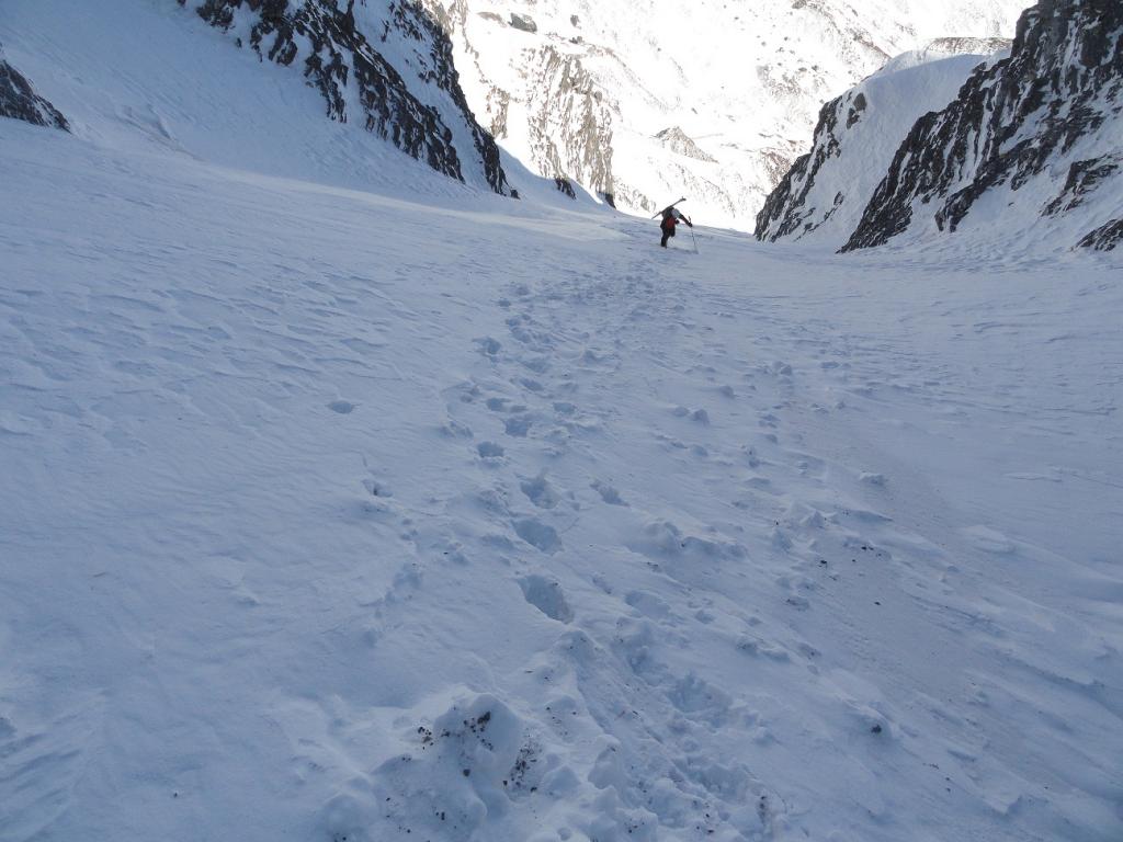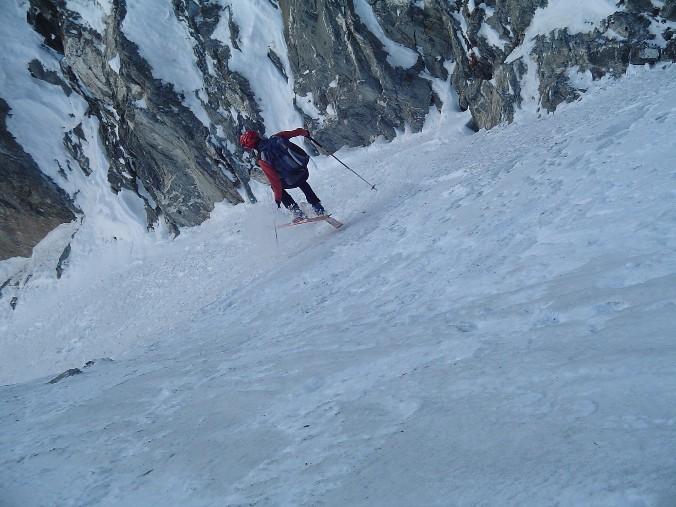 Pendenze: 45° dalla forcella per i primi cento metri. Poi le pendenze diminuiscono (40-35°), strettoie a 35°.