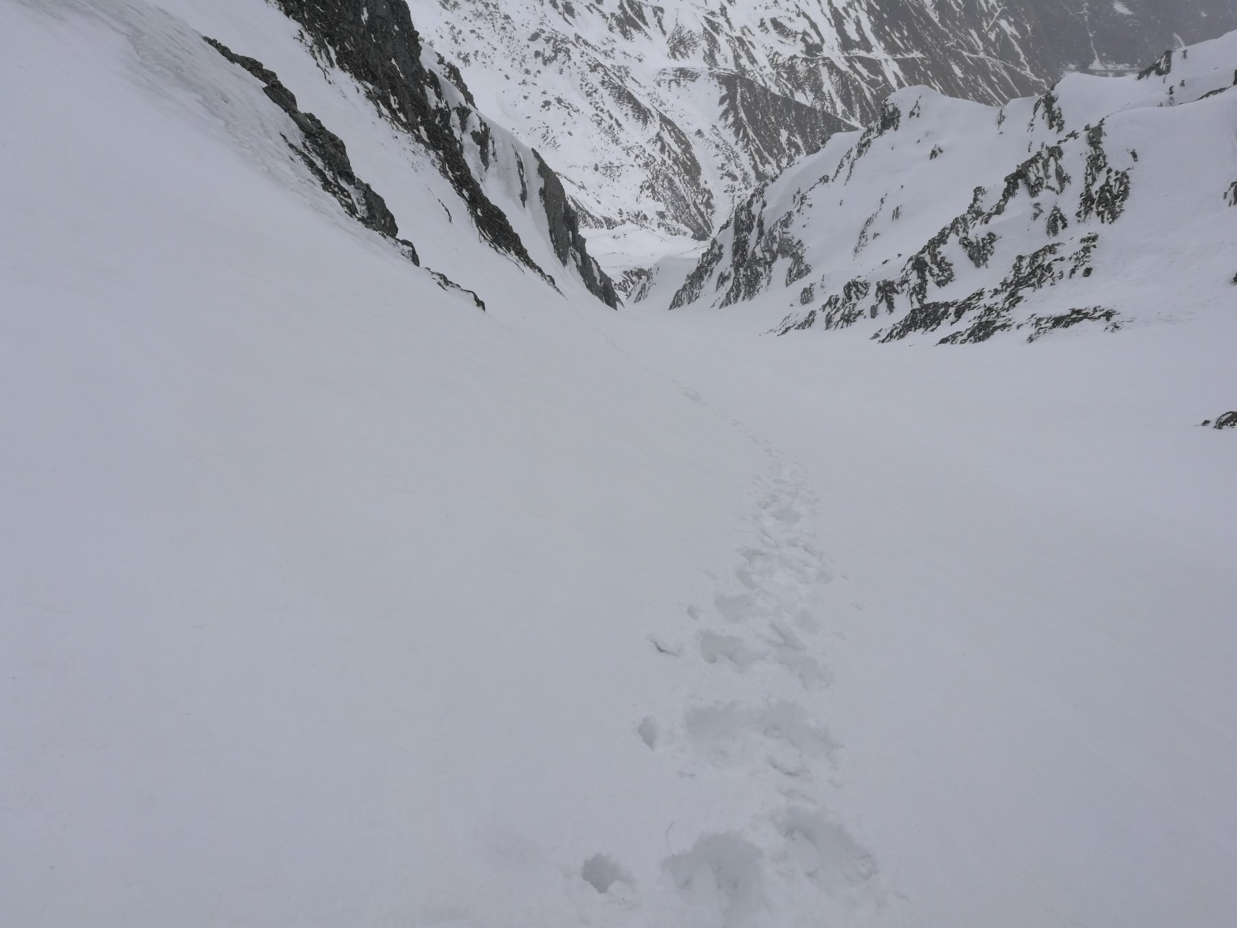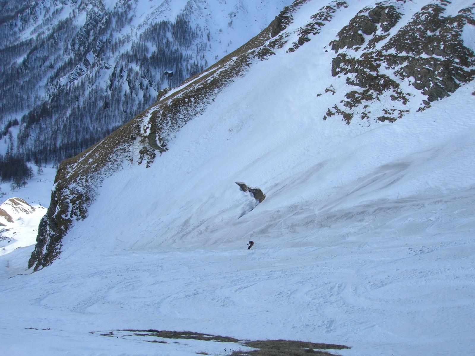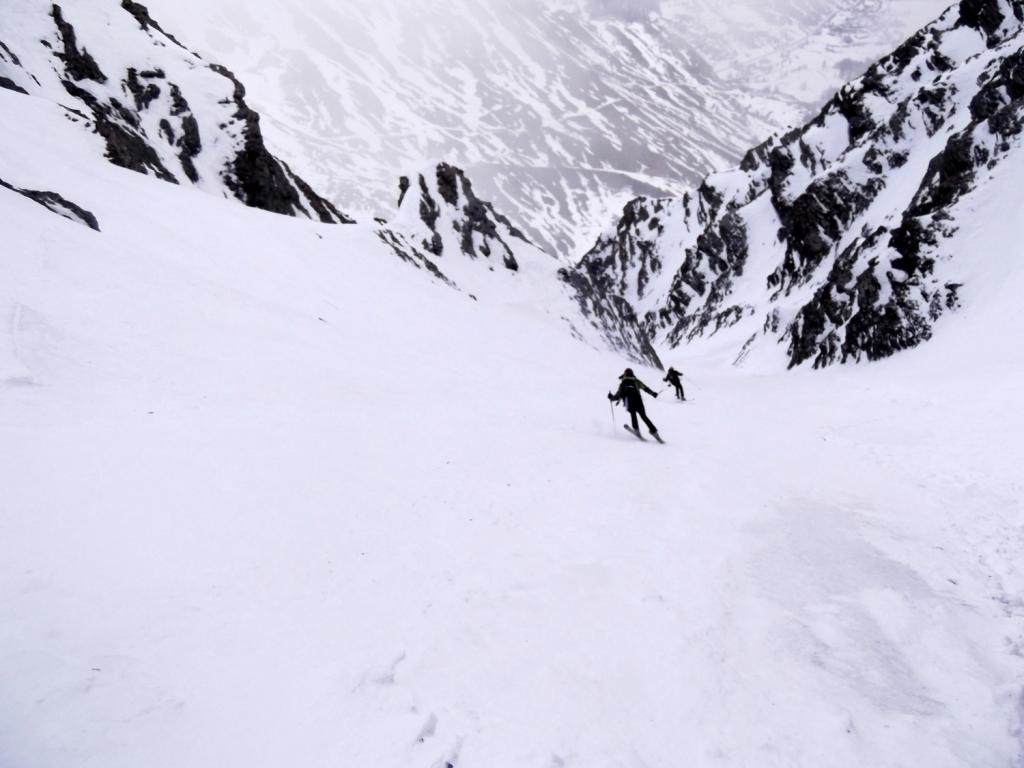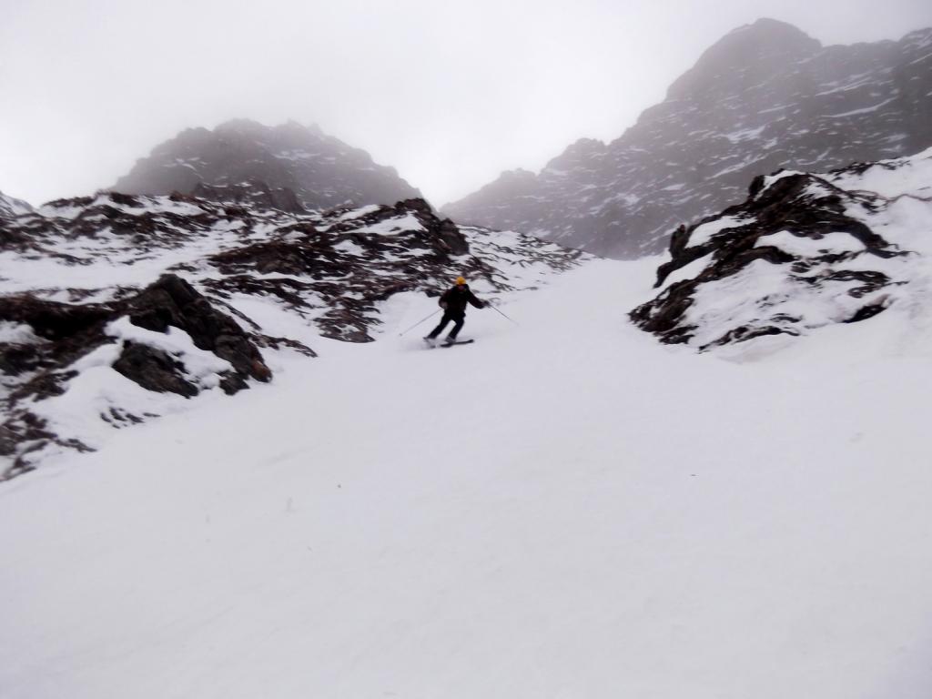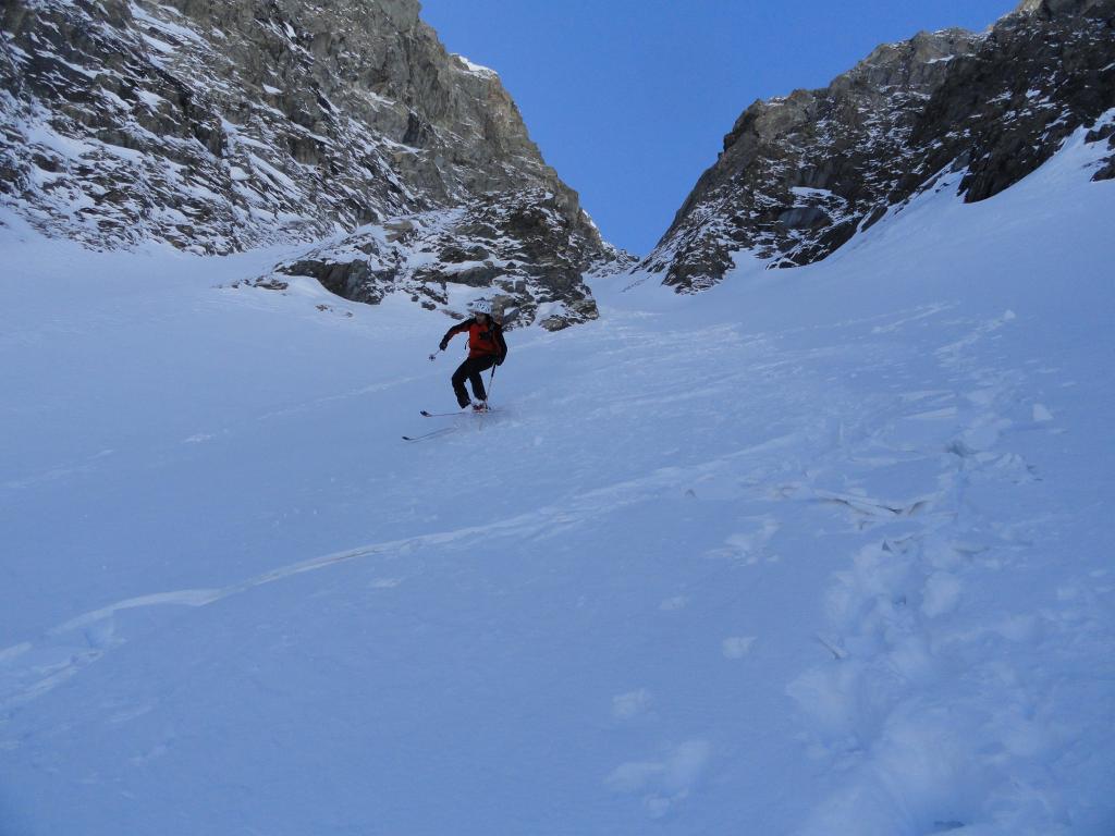 Pendenze: 45° dalla forcella per i primi cento metri. Poi le pendenze diminuiscono (40-35°), strettoie a 35°.