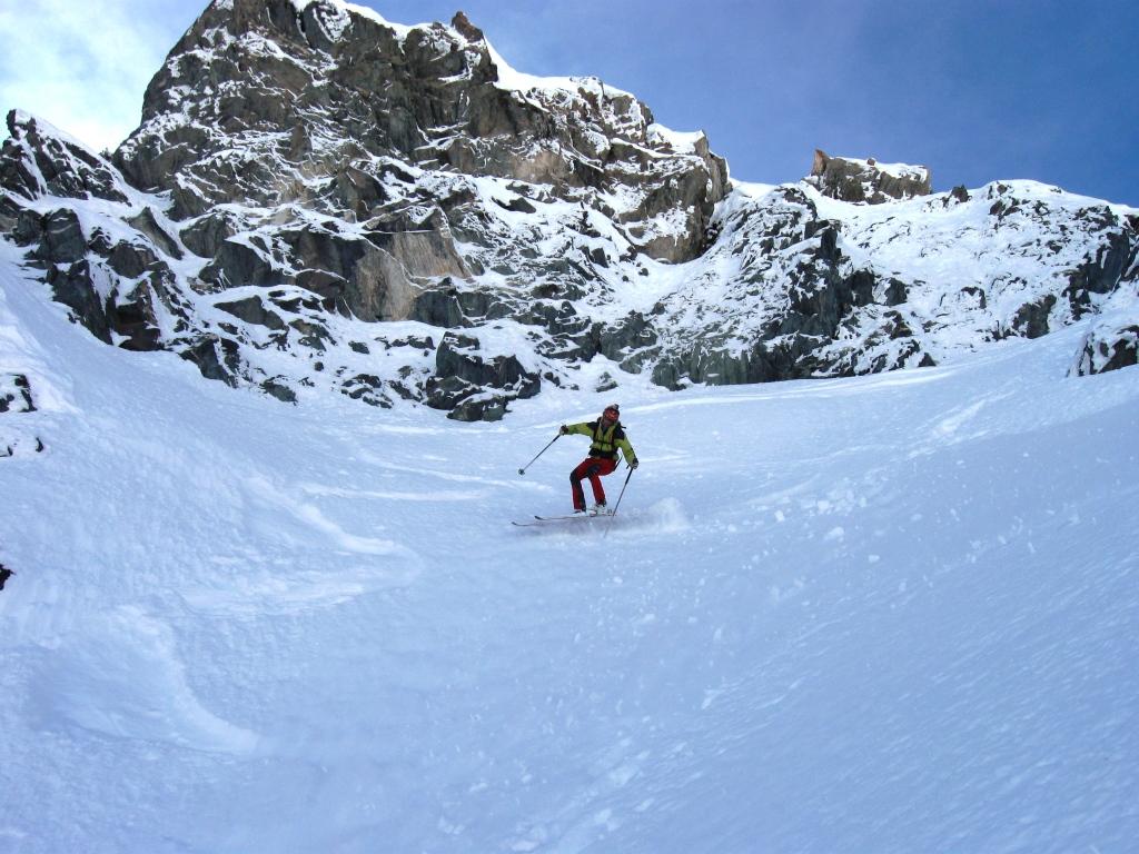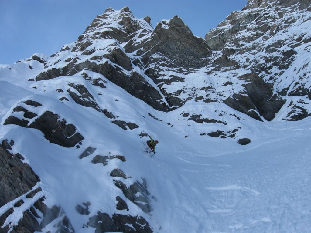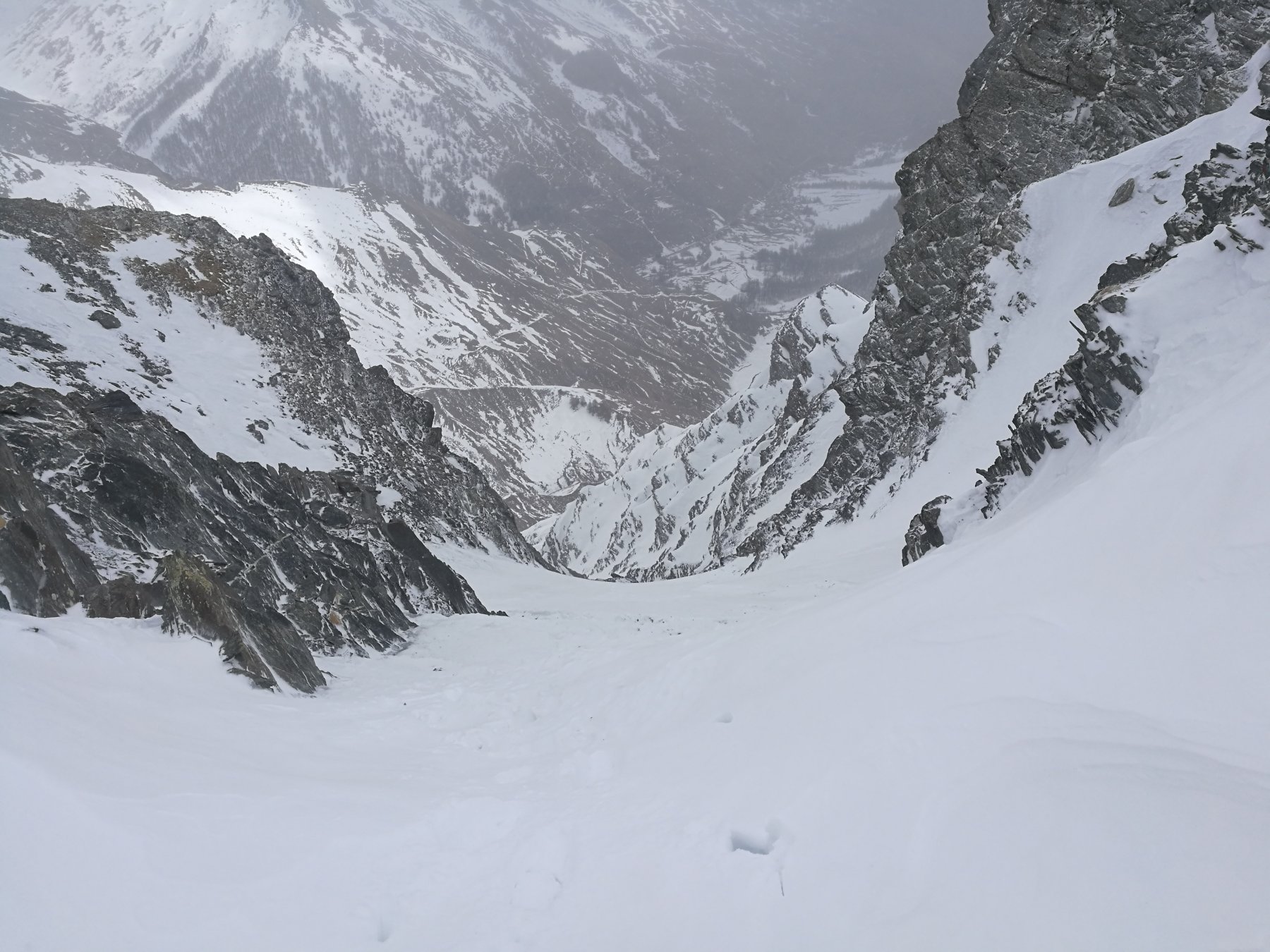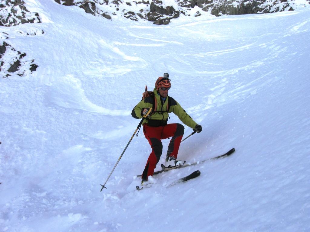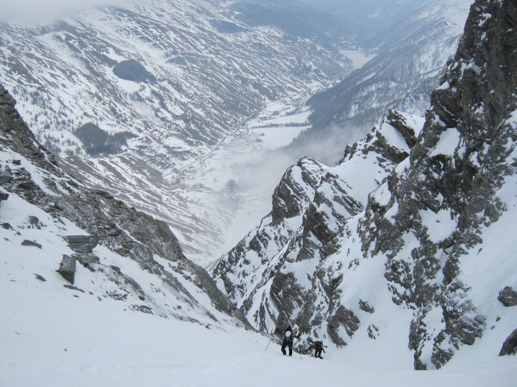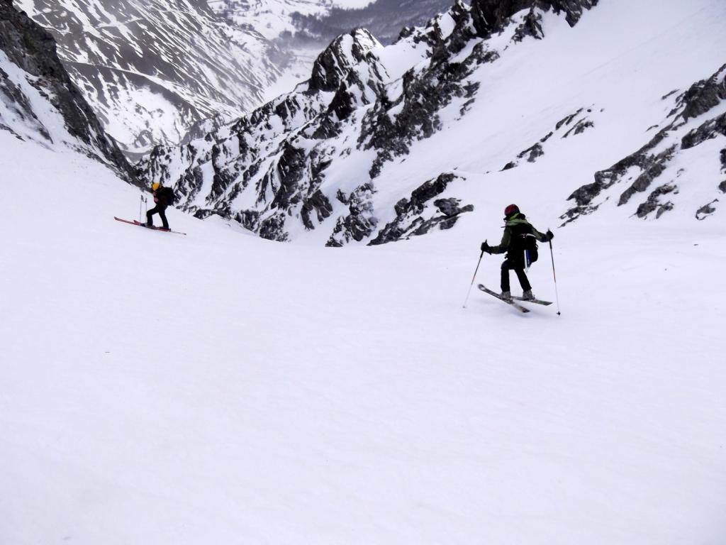 Pendenze: 45° dalla forcella per i primi cento metri. Poi le pendenze diminuiscono (40-35°), strettoie a 35°.