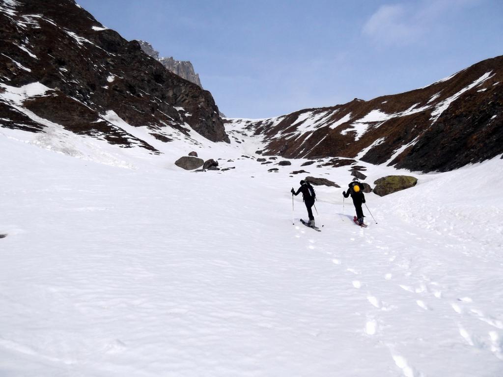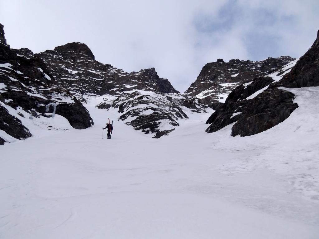 Risalire su facili pendii sino ad una strozzatura, superarla a destra e contiunuare a seguire il canale sino ad un punto dove si presentano due rami e prendere quello di destra sino all’uscita (2950 m., possibile cornice).