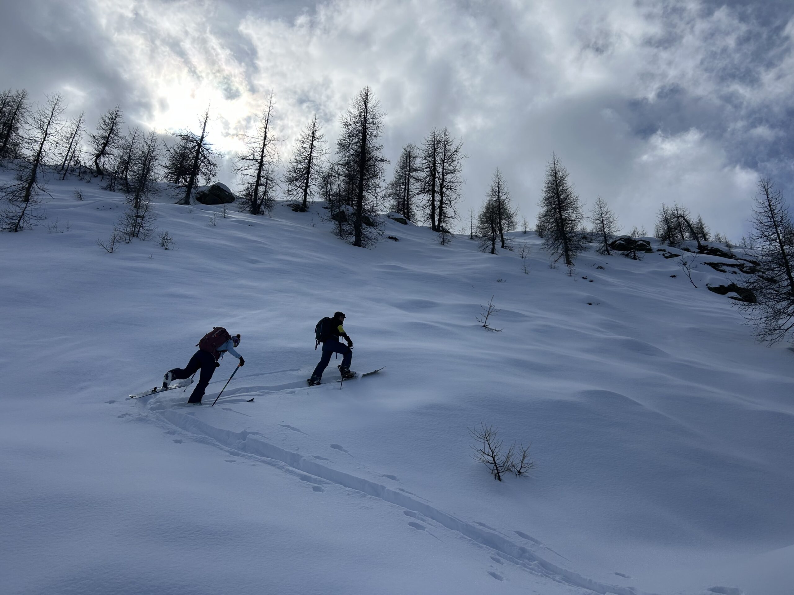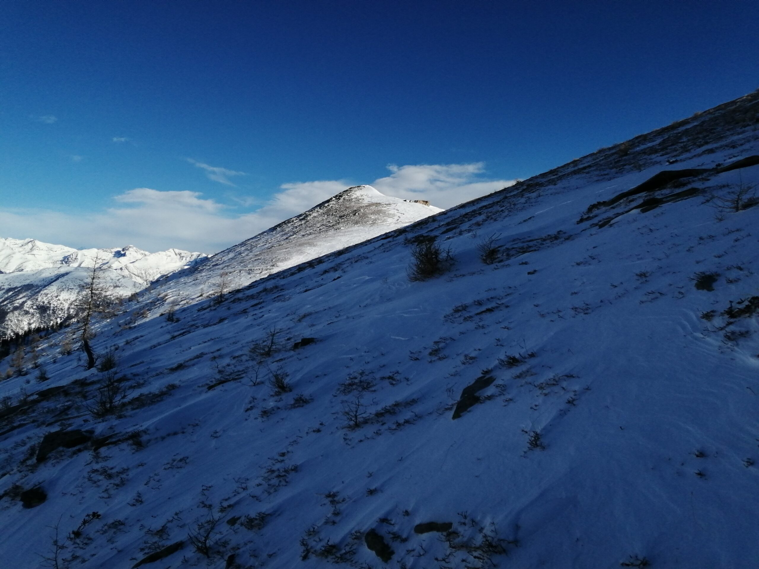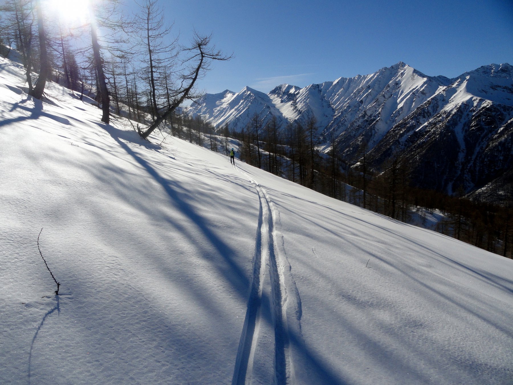Scendere tutto l’evidente canalone fino ad individuare sulla sx dopo circa 800m di dislivello (quota 1500ca) un vecchio sentiero ormai in disuso. Scendere ancora qualche decina di metri (quota 1440 ca)a seconda dell’innevamento e risalire a sx i pendii erbosi aggirando qualche balza rocciosa (attenzione). Si reperisce il sentiero che porta ad aggirare un costone. Da qui si vede sull’altro versante il sentiero e la prima delle antiche borgate da attraversare. Effettuare un traverso che porta ad attraversare un canale con residui di valanga e reperire finalmente il sentiero. Percorrerlo sci a spalle attraversando antiche borgate: La Roccia, Adreit, Poet inf., Cialves ed infine arrivare a Grangette dove si recupera l’auto.