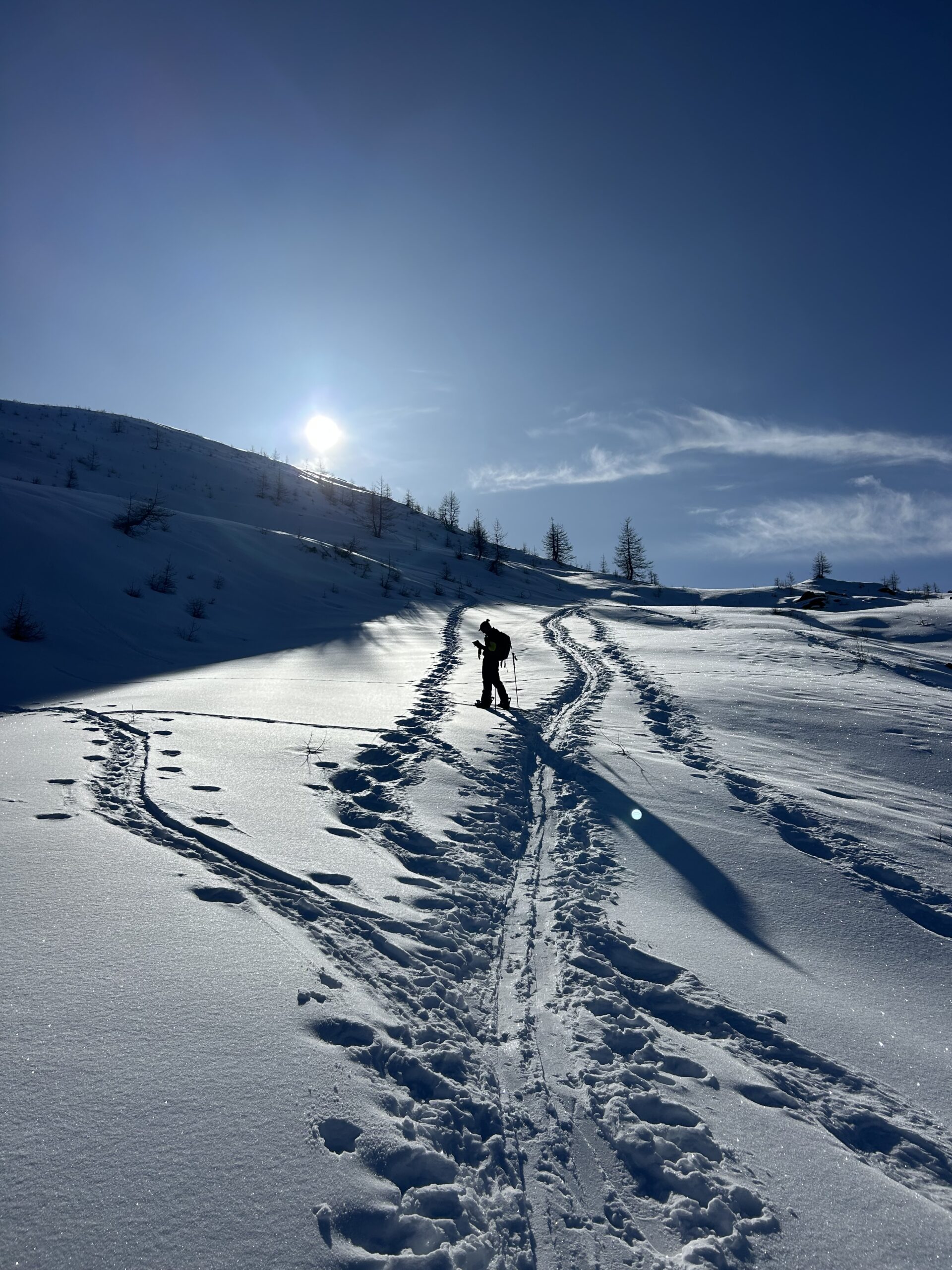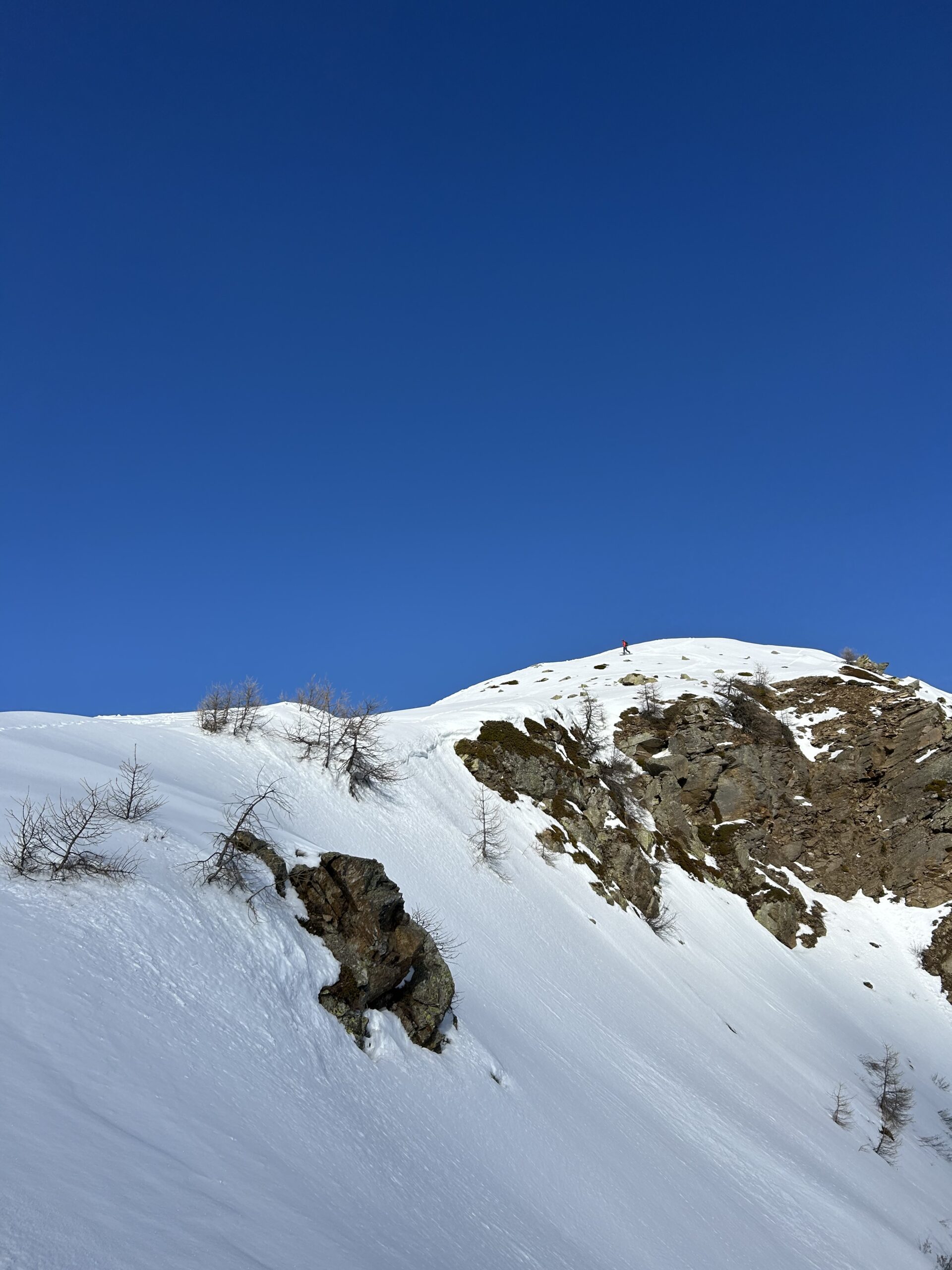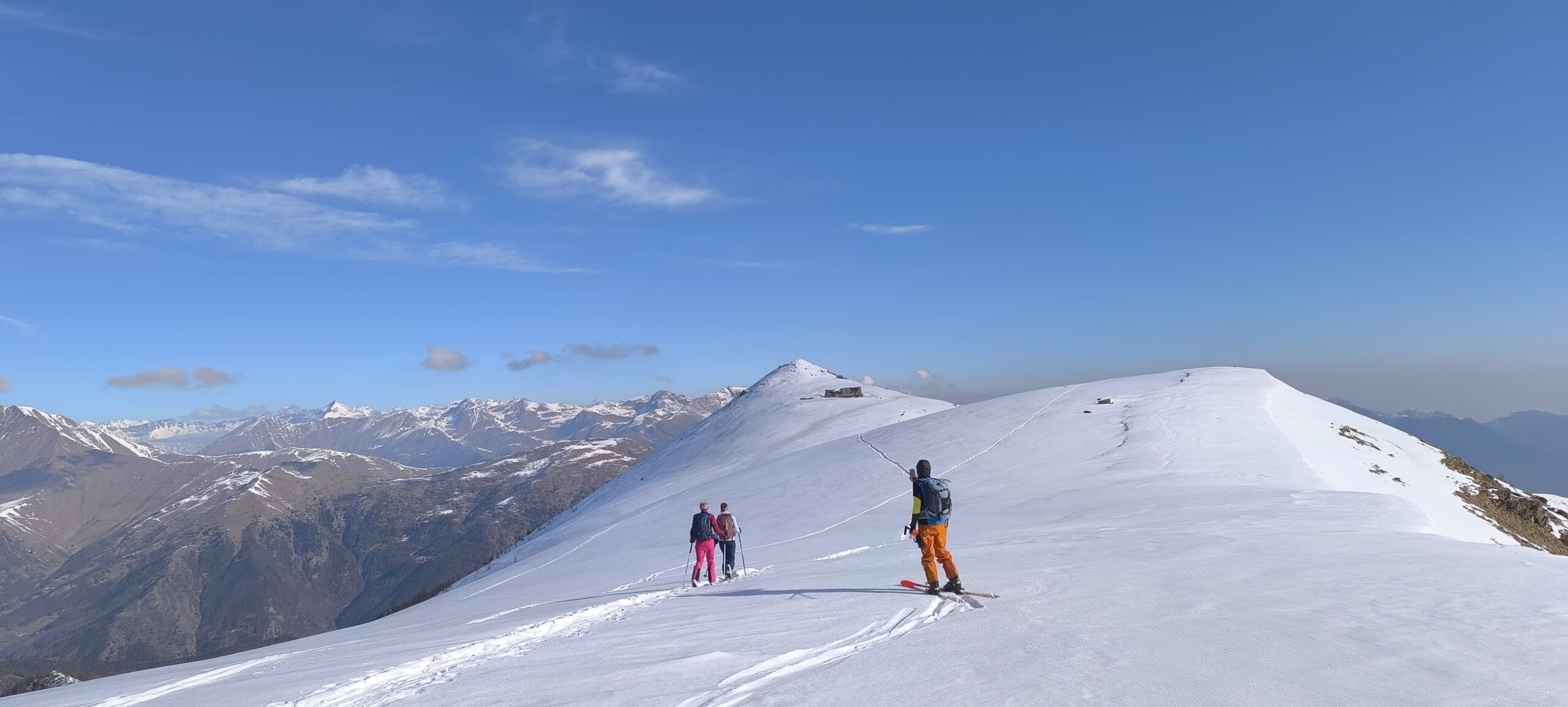 Scendere tutto l’evidente canalone fino ad individuare sulla sx dopo circa 800m di dislivello (quota 1500ca) un vecchio sentiero ormai in disuso. Scendere ancora qualche decina di metri (quota 1440 ca)a seconda dell’innevamento e risalire a sx i pendii erbosi aggirando qualche balza rocciosa (attenzione). Si reperisce il sentiero che porta ad aggirare un costone. Da qui si vede sull’altro versante il sentiero e la prima delle antiche borgate da attraversare. Effettuare un traverso che porta ad attraversare un canale con residui di valanga e reperire finalmente il sentiero. Percorrerlo sci a spalle attraversando antiche borgate: La Roccia, Adreit, Poet inf., Cialves ed infine arrivare a Grangette dove si recupera l’auto.