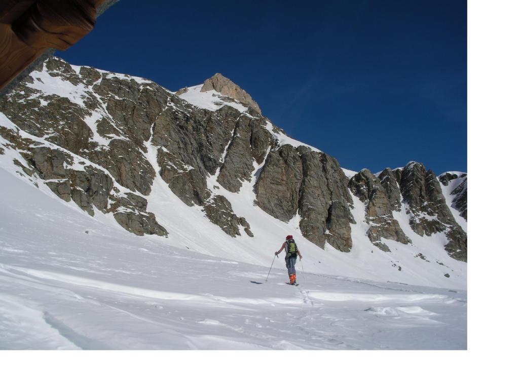 I lastroni da vento compatti di superfici ridotte, erano gli unici a dare un po’ di soddisfazione nel disegnare le curve. Per il resto gli altri tipi di neve ricoprenti superfici ben piu’ ampie, favorivano la caduta su crosta non portante con neve secca al di sotto. La condizione peggiore per lo sciatore alpinista. La temperatura al sole era gradevole, mentre sui crinali sopravento l’aria era gelida come sempre. Gran bell’ambiente questo del Nivolet, anche per le tante gite che ha da offrire; ma la neve questa benedetta neve, di lei non si puo’ certo dire la stessa cosa. Incontrato un enormita’ di quadrupedi, compresa una volpe affamata al parcheggio; ma anche un gran numero di bipedi tutti distribuiti lungo la strada ben battuta su al colle, ma con le ciaspole a penzolare giu’ dagli zaini tanto era duro il fondo stradale…Con Franco.