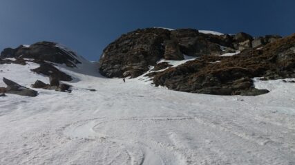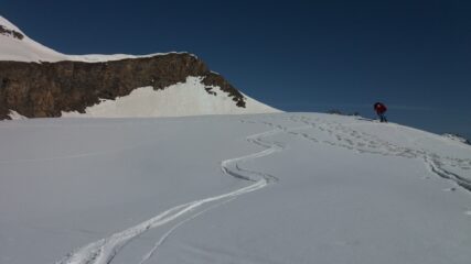 Poi continua e buona traccia su neve compatta trasformata. Panorama grandioso ed ampi spazi intonsi in discesa su neve spettacolare sino poco sotto la diga, poi sopravvivenza..