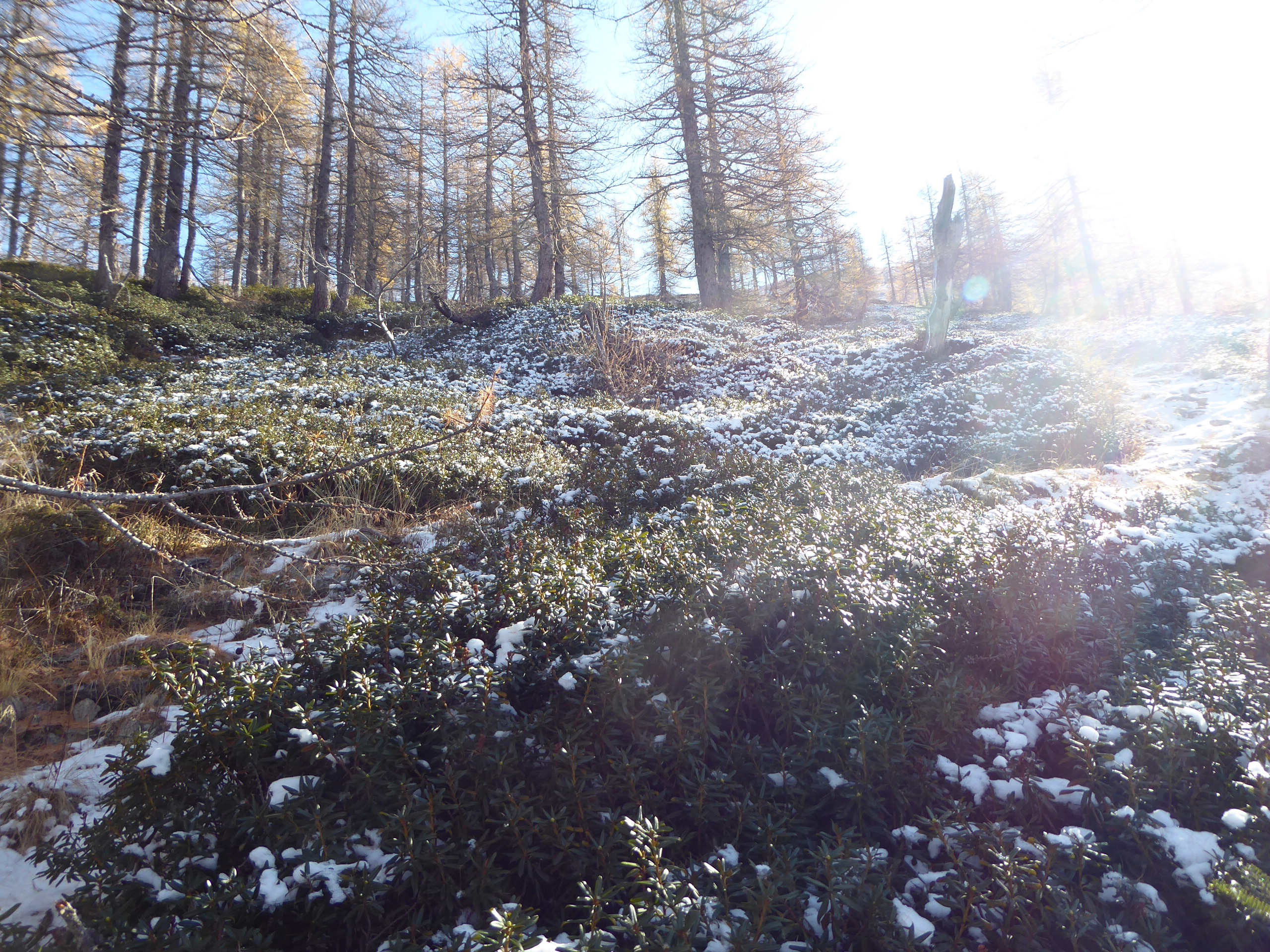 Prima neve della stagione, che si pesta già lungo la strada dai 1700 metri in su; la temperatura (meno due alla partenza) non aiuta lo scioglimento… Seguita sempre la comoda sterrata fino alla colletta Sellar, subito prima della quale un comodissimo sentiero risale sino al colle della Balma in un ambiente molto aperto. Ruderi della caserma, cima 2384 e breve discesa per salire alla punta con la croce (2379), sempre tra macchie di neve: panorama esteso. Ritorno per la mulattiera fino al lago di Envie e poi il sentiero innevato e a tratti ghiacciato (in queste condizioni EE) fino ad Indiritti a chiudere il panoramico anello.