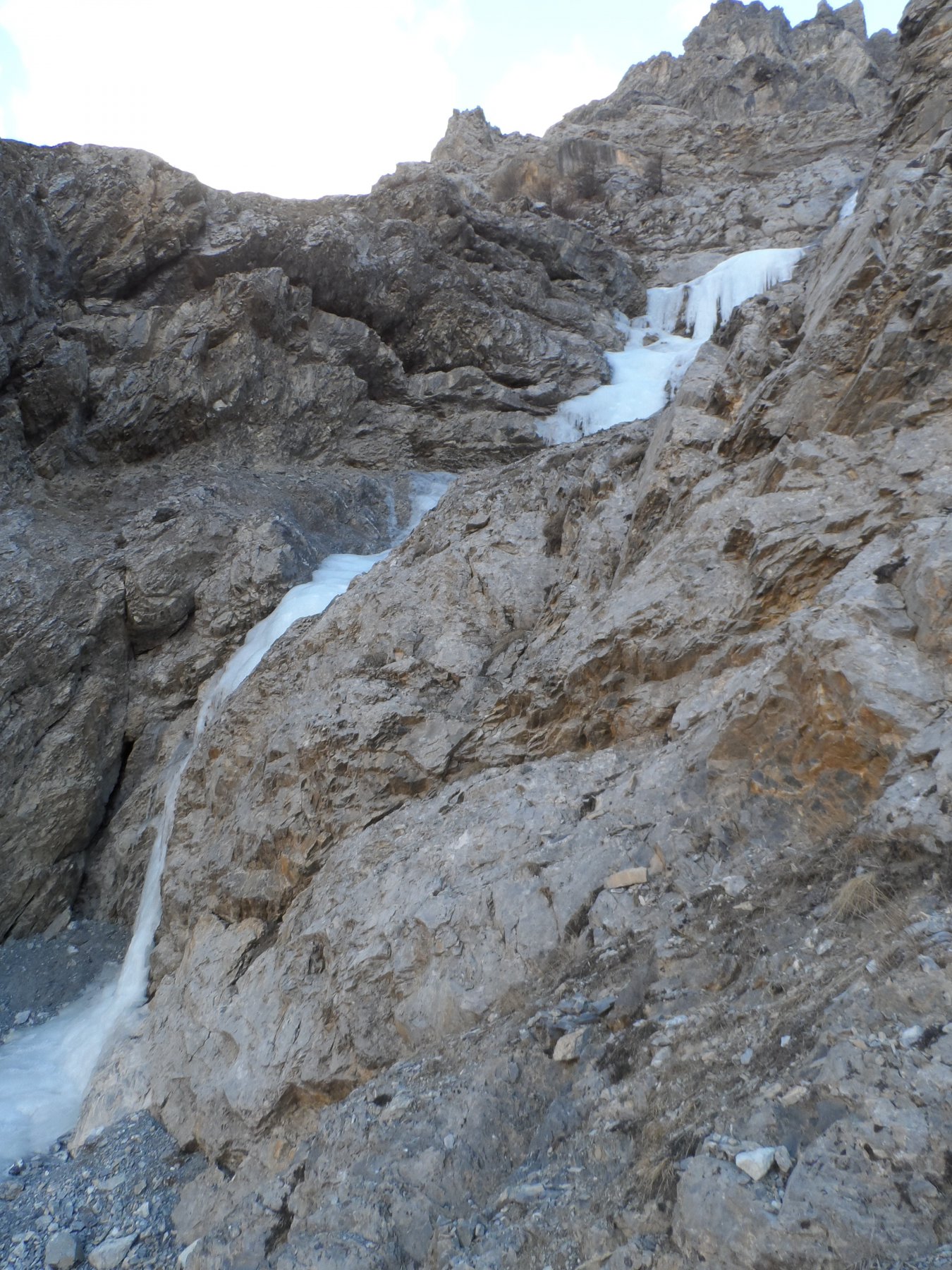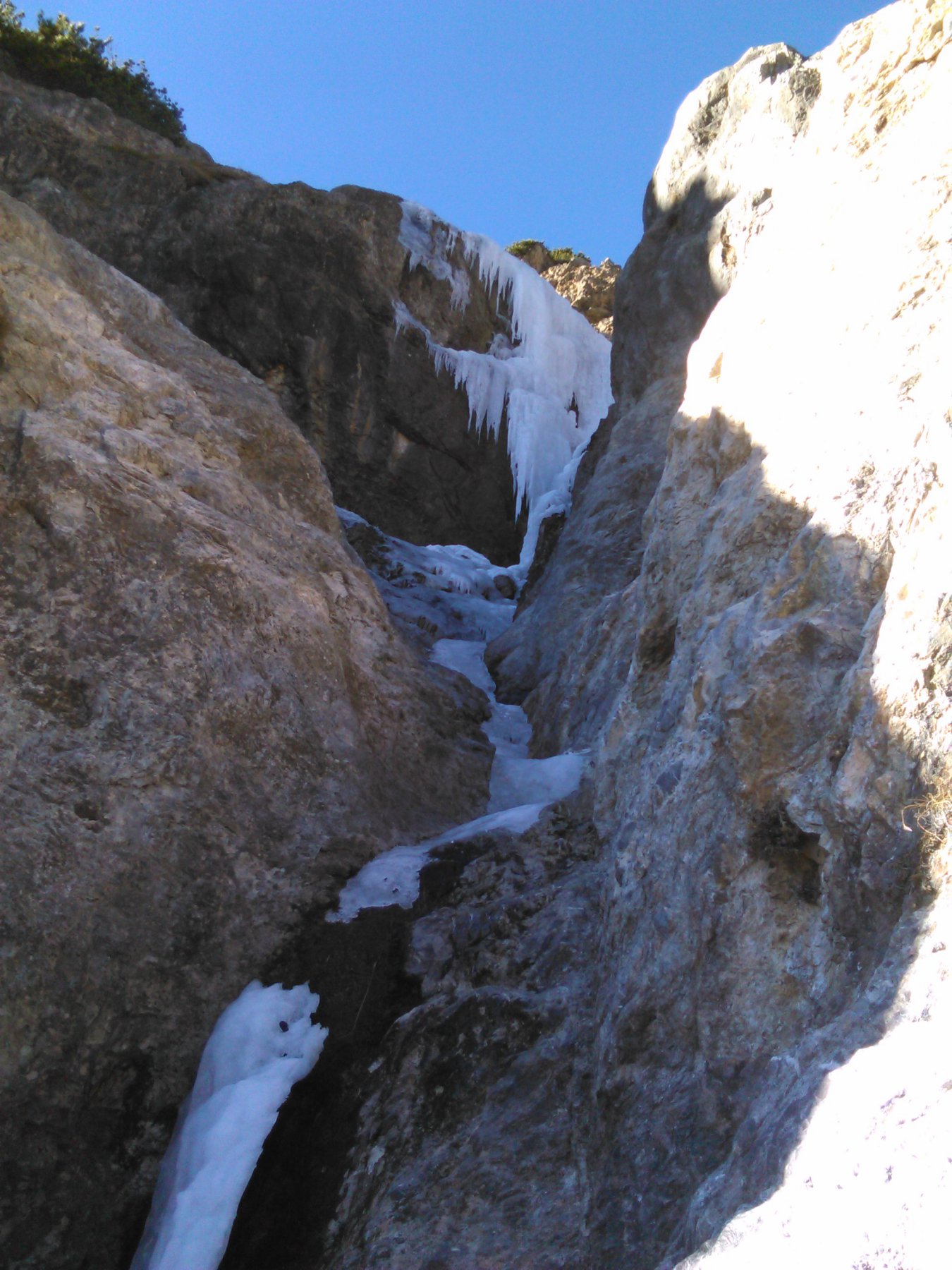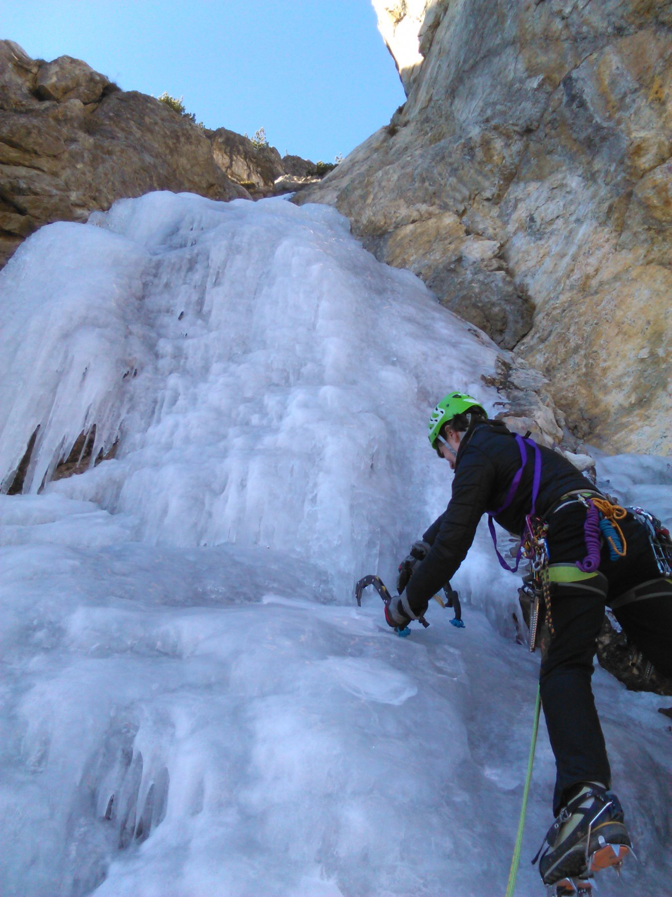 1° tiro, 55 mt : partenza su placca facile appoggiata ma delicata per il ghiaccio sottile, proseguire fino ad saltino di 6 metri a 85 gradi, al termine del quale si può far sosta su ghiaccio.