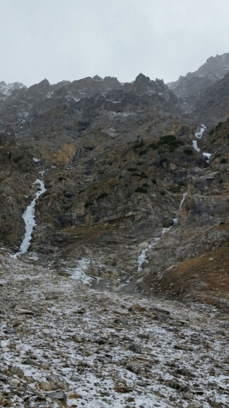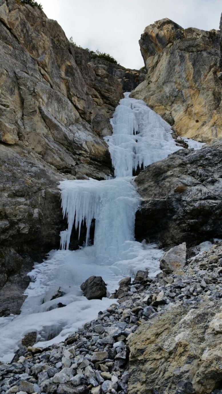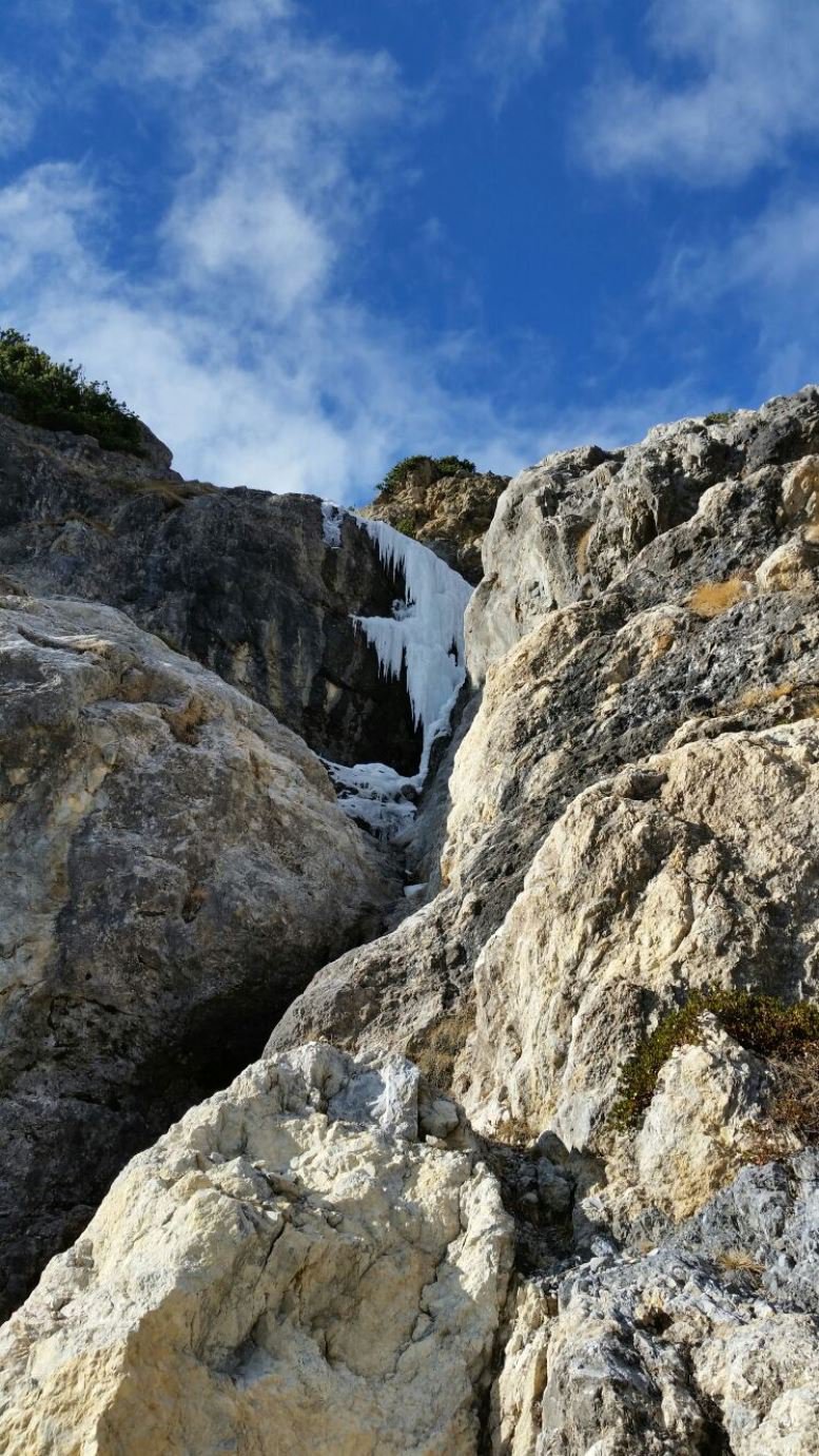 1° tiro, 55 mt : partenza su placca facile appoggiata ma delicata per il ghiaccio sottile, proseguire fino ad saltino di 6 metri a 85 gradi, al termine del quale si può far sosta su ghiaccio.