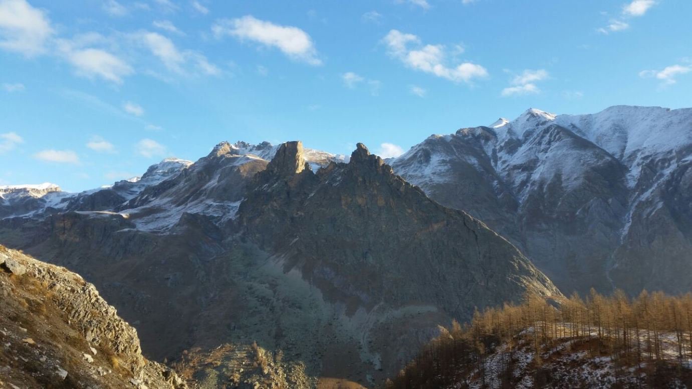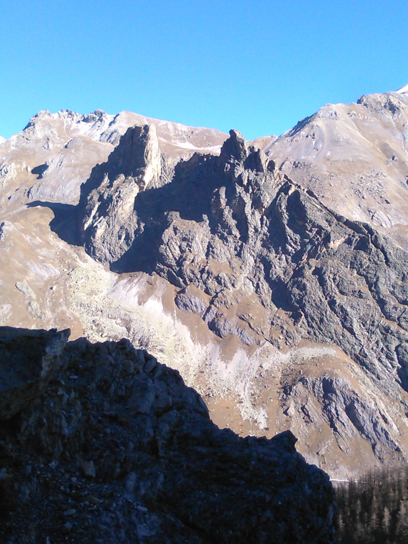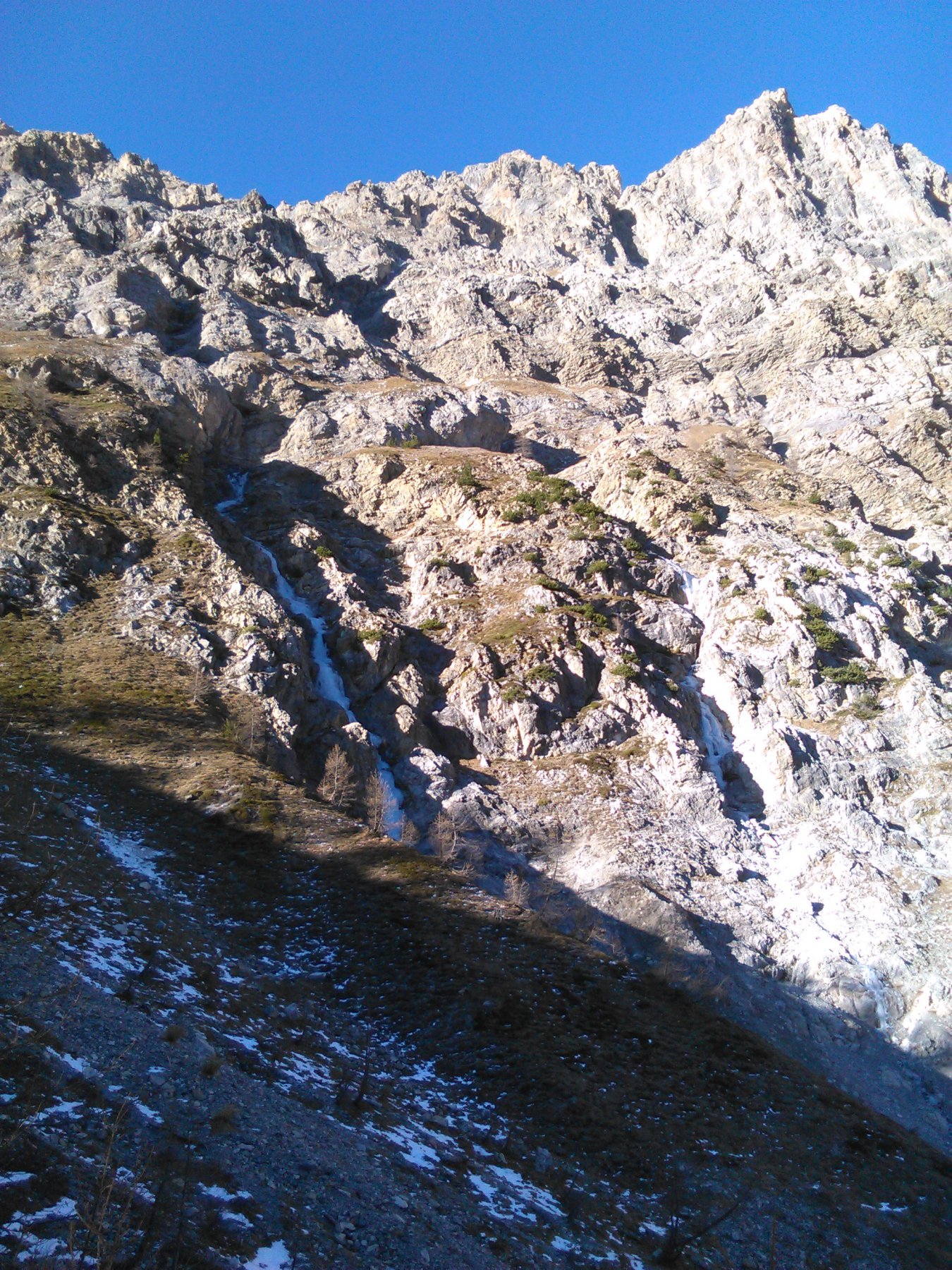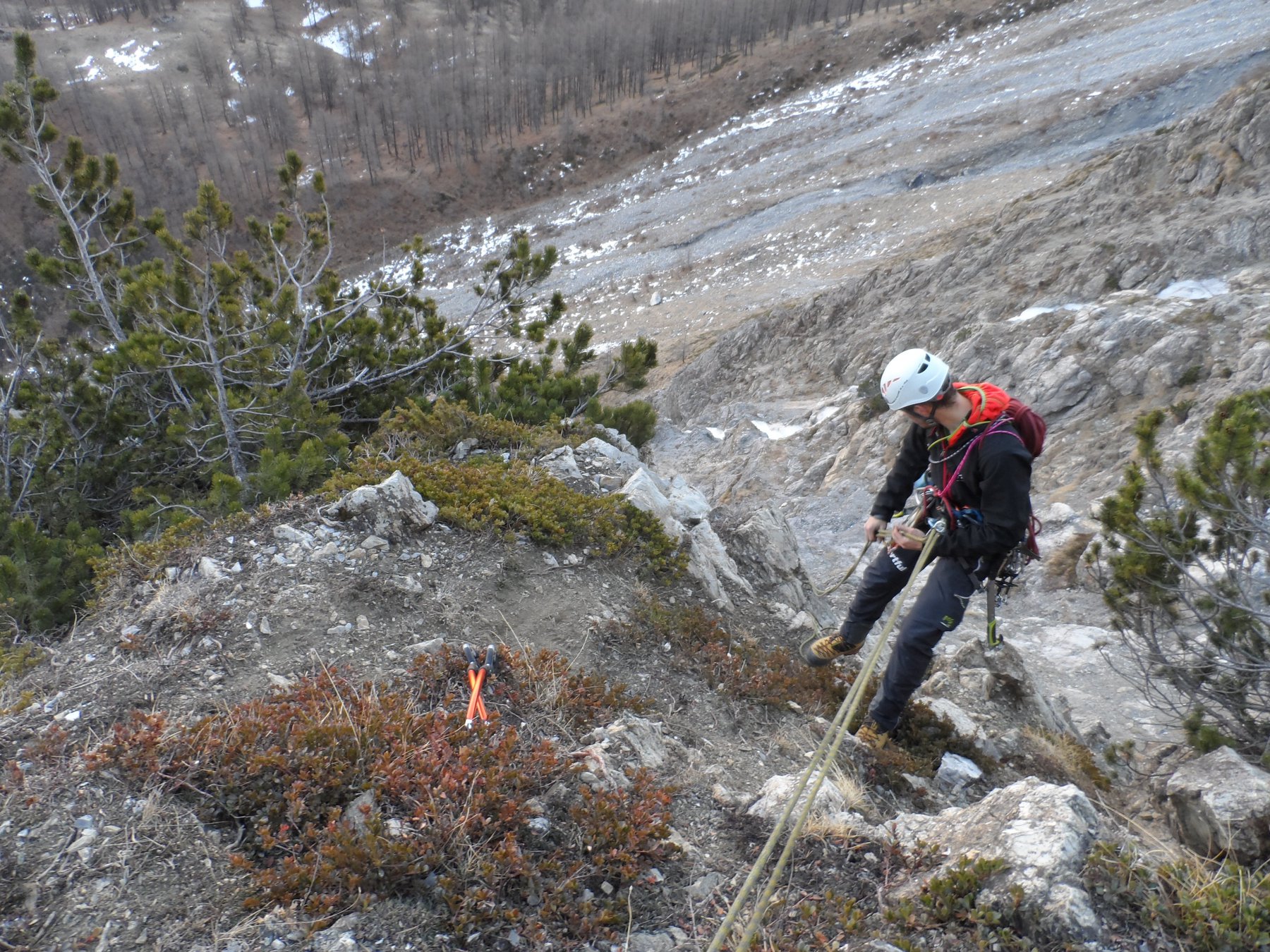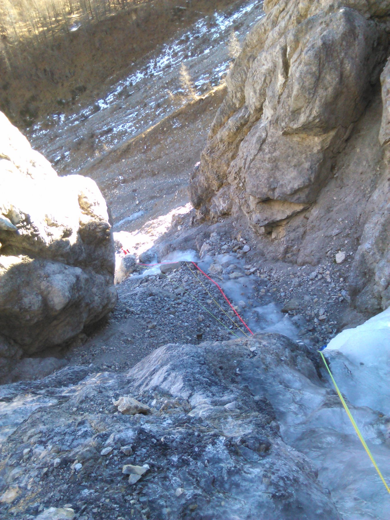 se no dalla fine dell’ ultimo tiro si scende comodamente per ripido pendio sulla dx, (sx orografica) fino alla base del 3°tiro. (da qui o doppia su grande larice sottostante oppure a dx a piedi per poi scendere in doppia sulla pertusà)