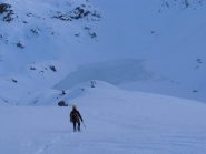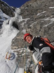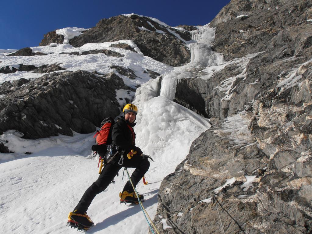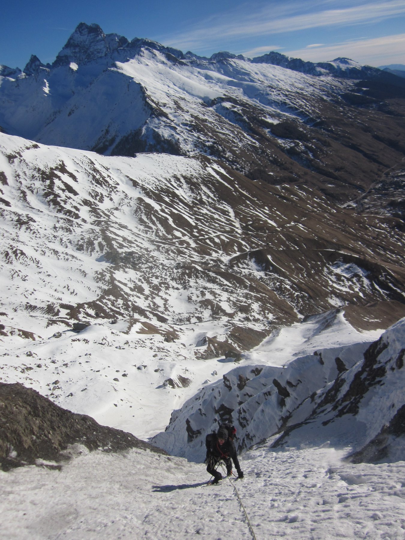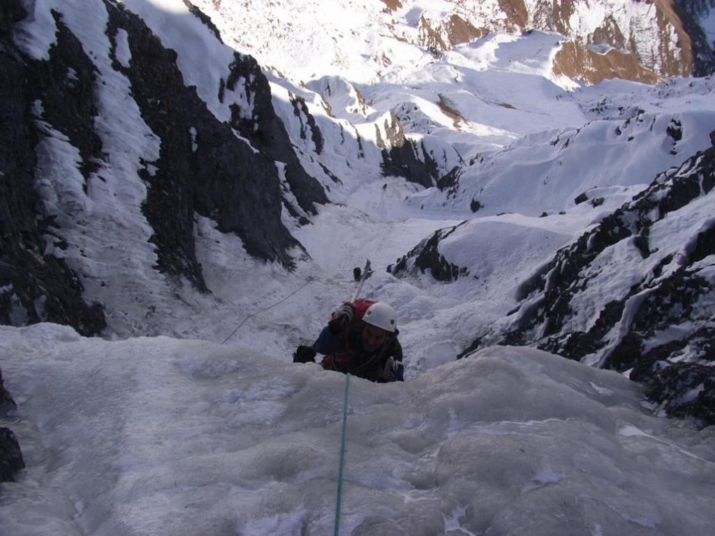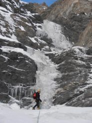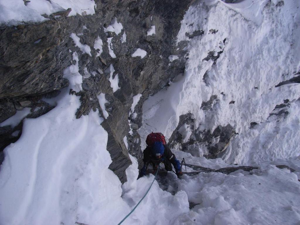 Risalire il canale nevoso da q. 2400, affrontare una prima serie di salti verticali (80 m), proseguire per il canale nevoso fino ad un salto (75 gradi, 20 m), breve canale, poi un secondo salto più breve, salire il canale nevoso fino ad un salto di 35 m. (80 gradi), proseguire nel canale che restrige fino ad un salto (90 gradi, 10 m) con ghiaccio sottile, salire il canale ristretto (55 gradi) per 60 metri, uscita delicata a 65 gradi in un diedro nevoso. Sosta sulla cengia. Traverso delicato verso sx su misto (friend utili), tra le rocce salire in verticale fino al filo di cresta, poi di nuovo a sx superando due cenge esposte dopo le quali si esce in cime.