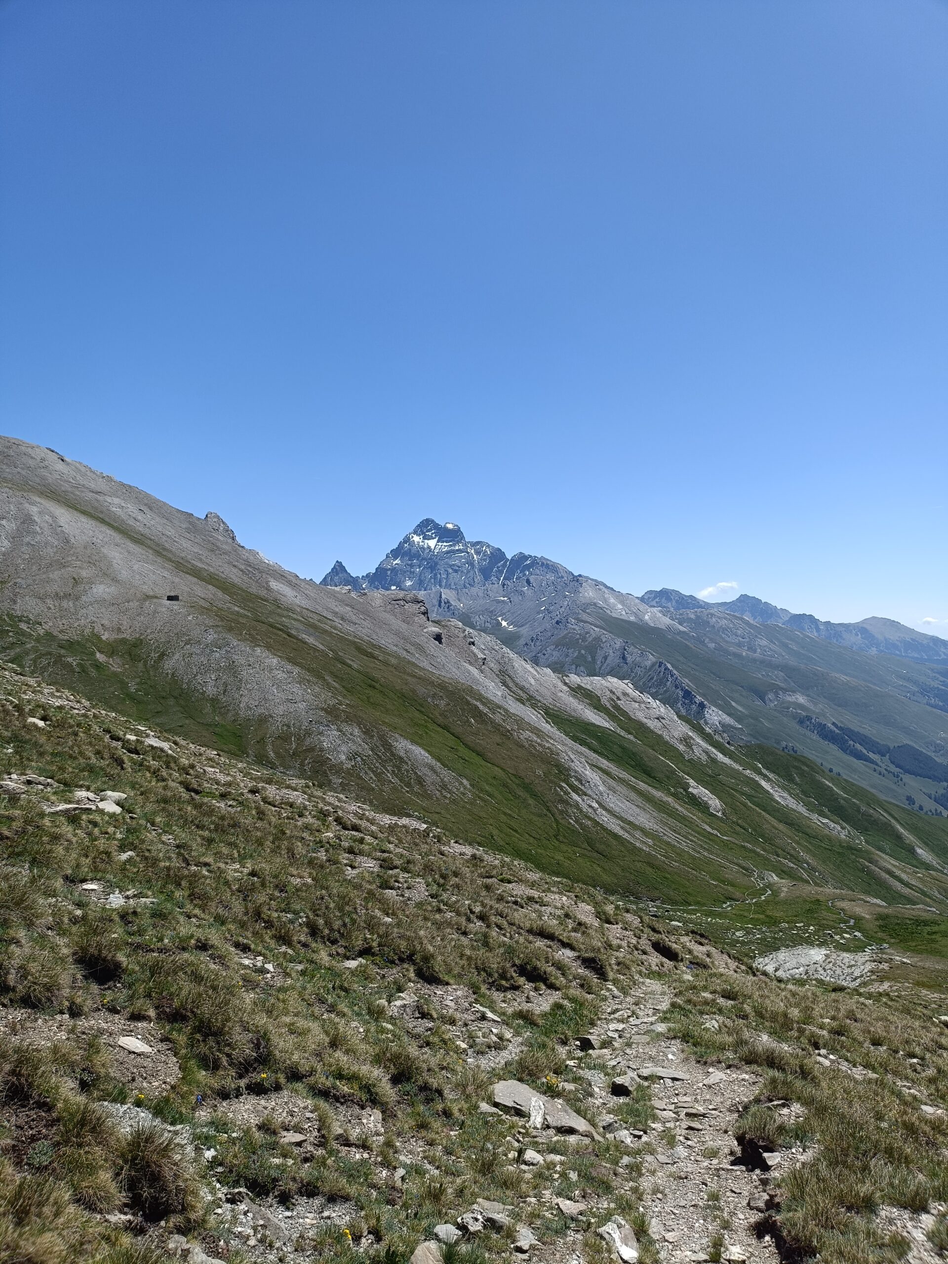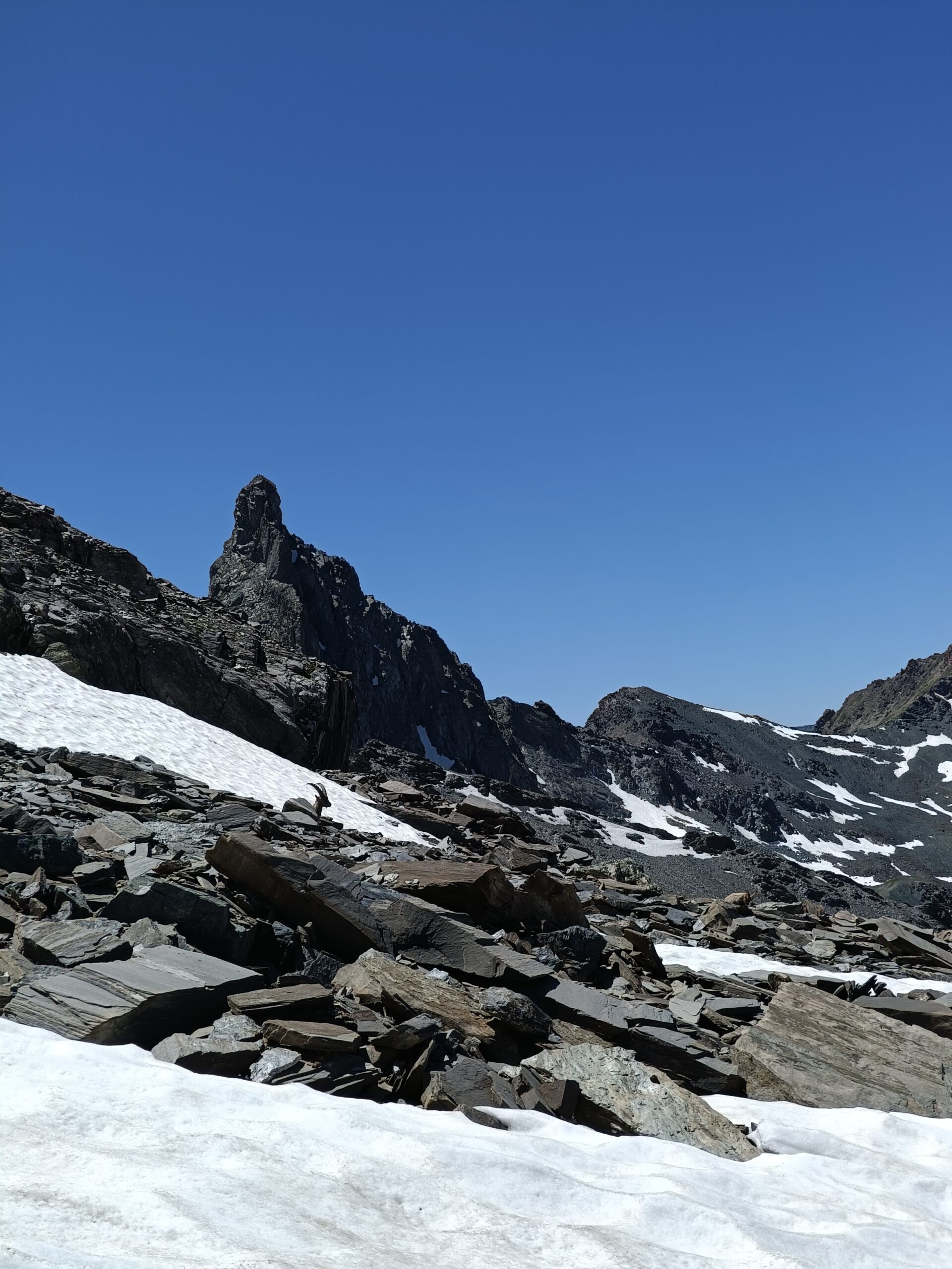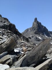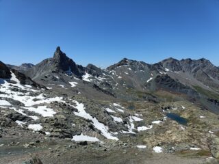 Si risale a sinistra il sentiero di cresta verso la Rocca Bianca, che si lascia quando questo svolta a sinistra e si seguono gli ometti che, su pietraia scendono verso i laghi della Blanche.