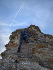Dopo il chiodo sullo scudo che sbarra la cresta scesi qualche metro e poi dritto a dx del filo, primi passi più verticali ed expo poi semplice.
