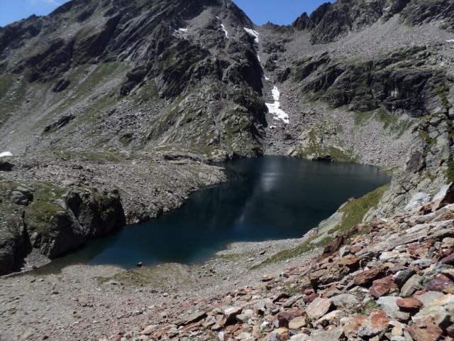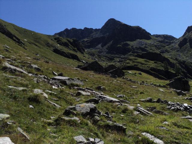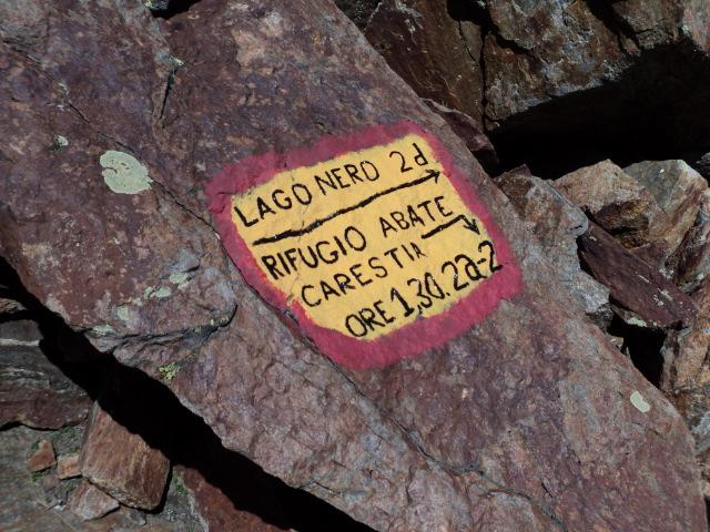 Il sentiero dal Passo dell’Alpetto fino al Lago Nero e’ alquanto scomodo: di fatto e’ un “traversone”, per buona parte privo di traccia, su pendii erbosi piuttosto scoscesi.