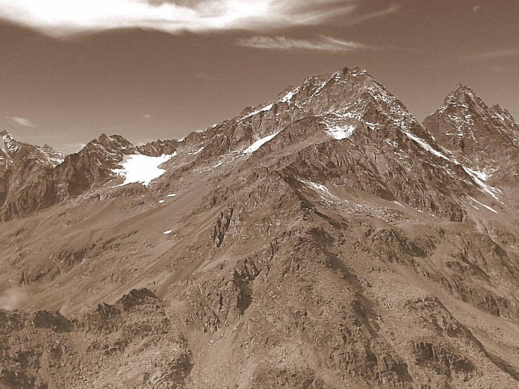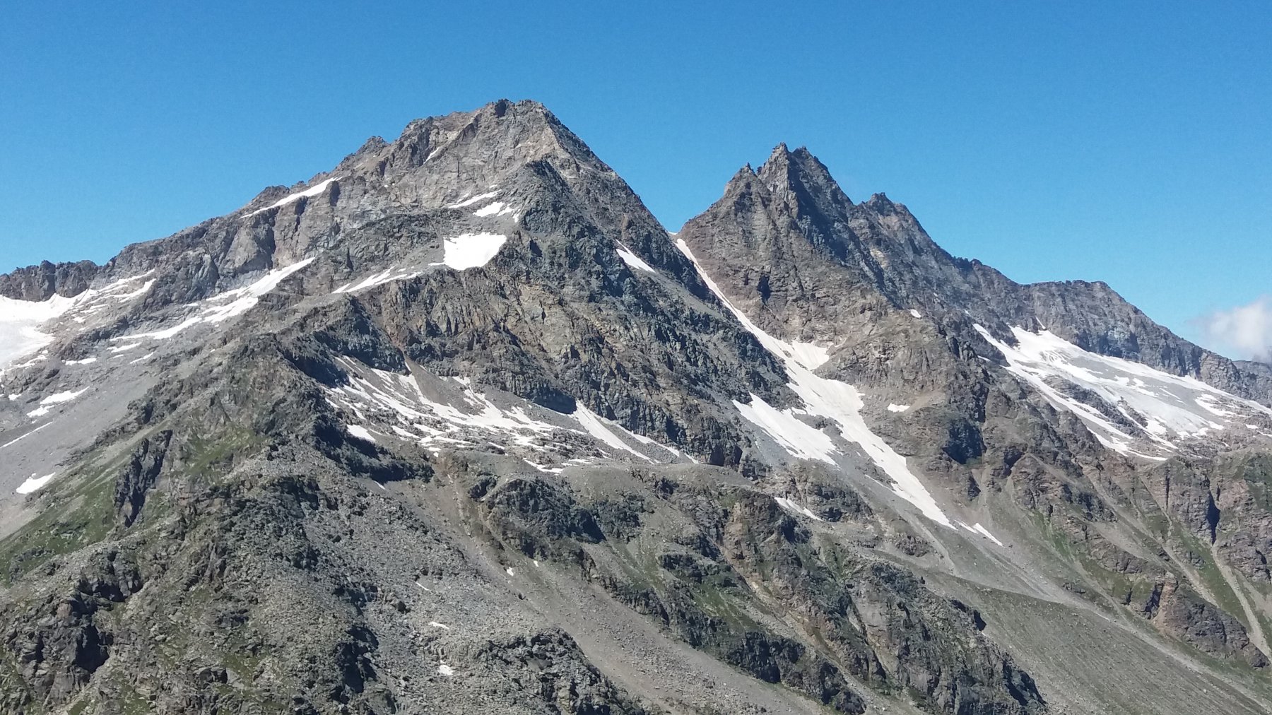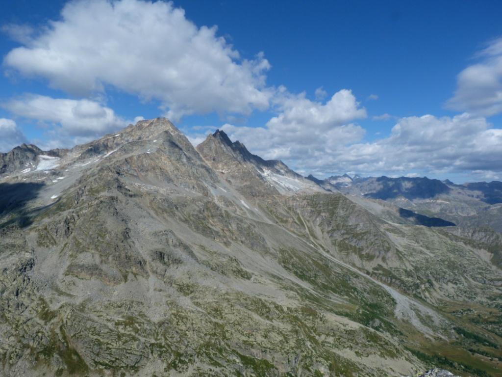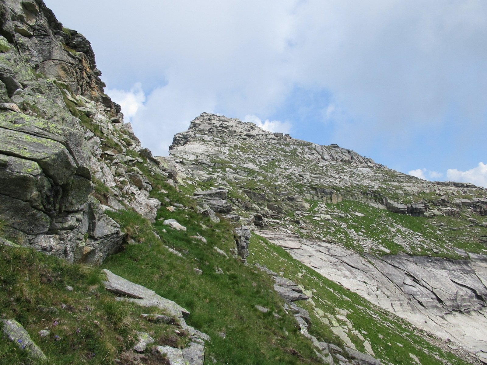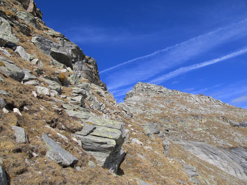A quota 2400 m circa si scorge una traccia che obliqua da sinistra a destra, probabilmente è un punto di accesso alla conca sotto la punta, ma la traccia più evidente continua a sinistra, superando altre bastionate (si passa accanto ad una enorme placca liscia) raggiungendo così l’altopiano sotto la lunga cresta che collega il Barrouard al Piccolo Morion. Il Corno Bianco da qui non si vede. Occorre risalire portandosi in cresta, oppure individuare poco sotto sul pendio erboso una delle vaghe tracce, e iniziare un lunghissimo mezza costa che aggira dal basso tutte le asperità, fino ad svalicare nella valletta dalla quale finalmente si vede la cima Est del Corno Bianco, allungata e spostata verso la Valle Orco. Si risale facilmente al colletto che separa le due punte, di simile altezza; per la Ovest si risale la cresta di rocce ed erba fino in punta, per la Est con percorso a piacere ci si districa sui grossi blocchi accatastati (attenzione perché si muovono anche massi enormi) fino all’ometto di pietre della cima.