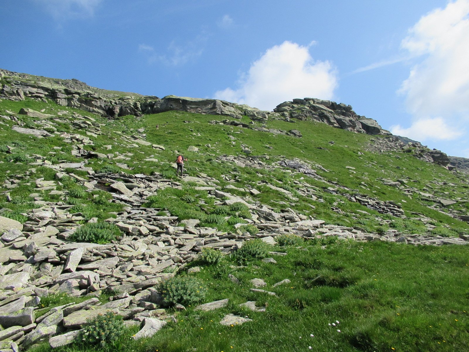 A monte del Gias Giom, a fianco del ruscello che precede le baite, si può iniziare a salire sulla destra per il ripido pascolo, toccando successivi ripiani erbosi intervallati da paretine di roccia facilmente aggirabili. In questa zona gli ometti ci sono anche se sparsi e confusionari. Conviene sempre mantenersi sulla sinistra dei pendii salendo parallelamente alla crestona del Barrouard.