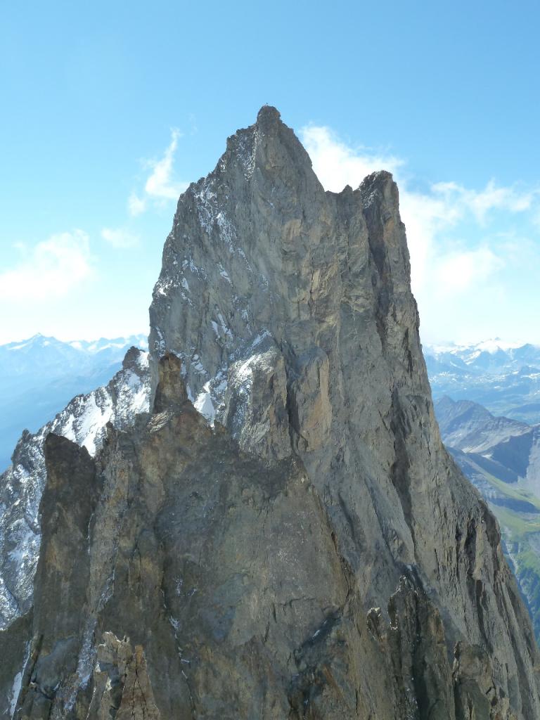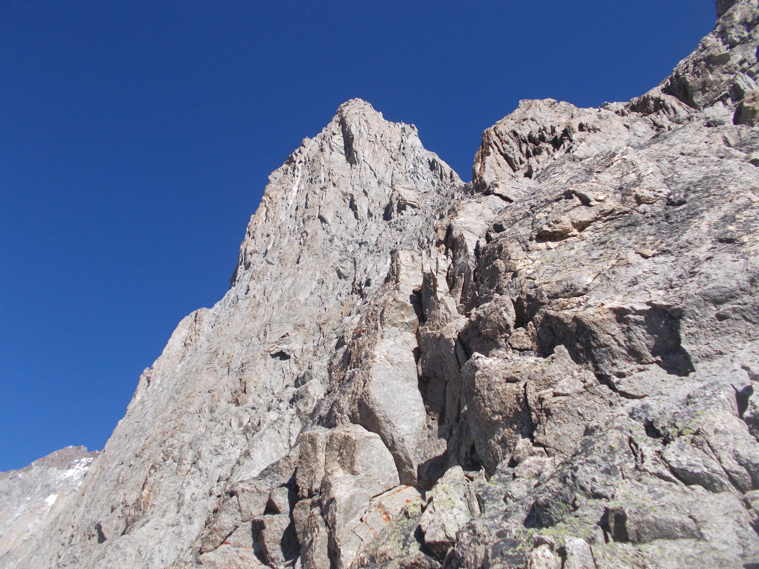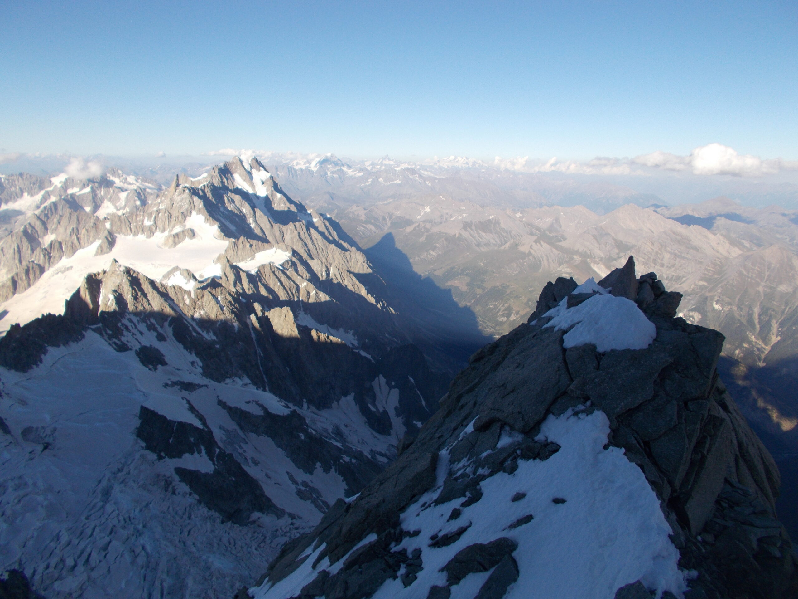 Giunti sotto la Blanche si affronta la sua parete SW per le classiche cenge Schneider (III/IV). Qui si arrampica su roccia a tratti sfasciata, ma la bellezza dell’ambiente fa dimenticare anche questo. Si raggiunge la rocciosa cresta SE aggirando il Pic Gugliermina.