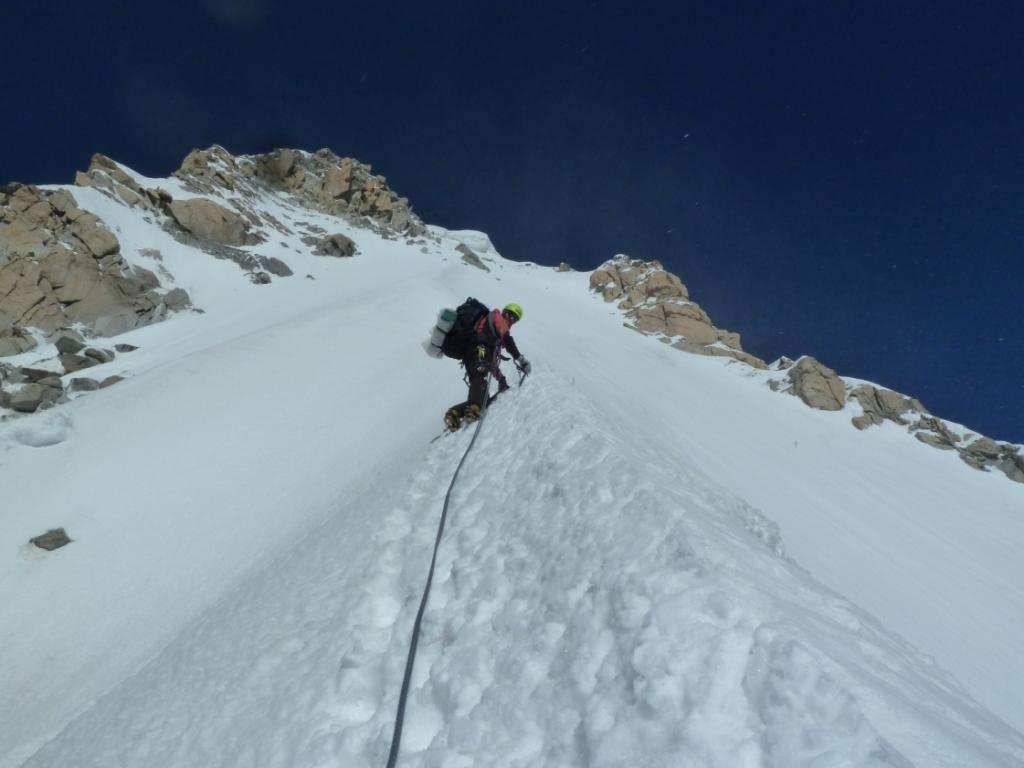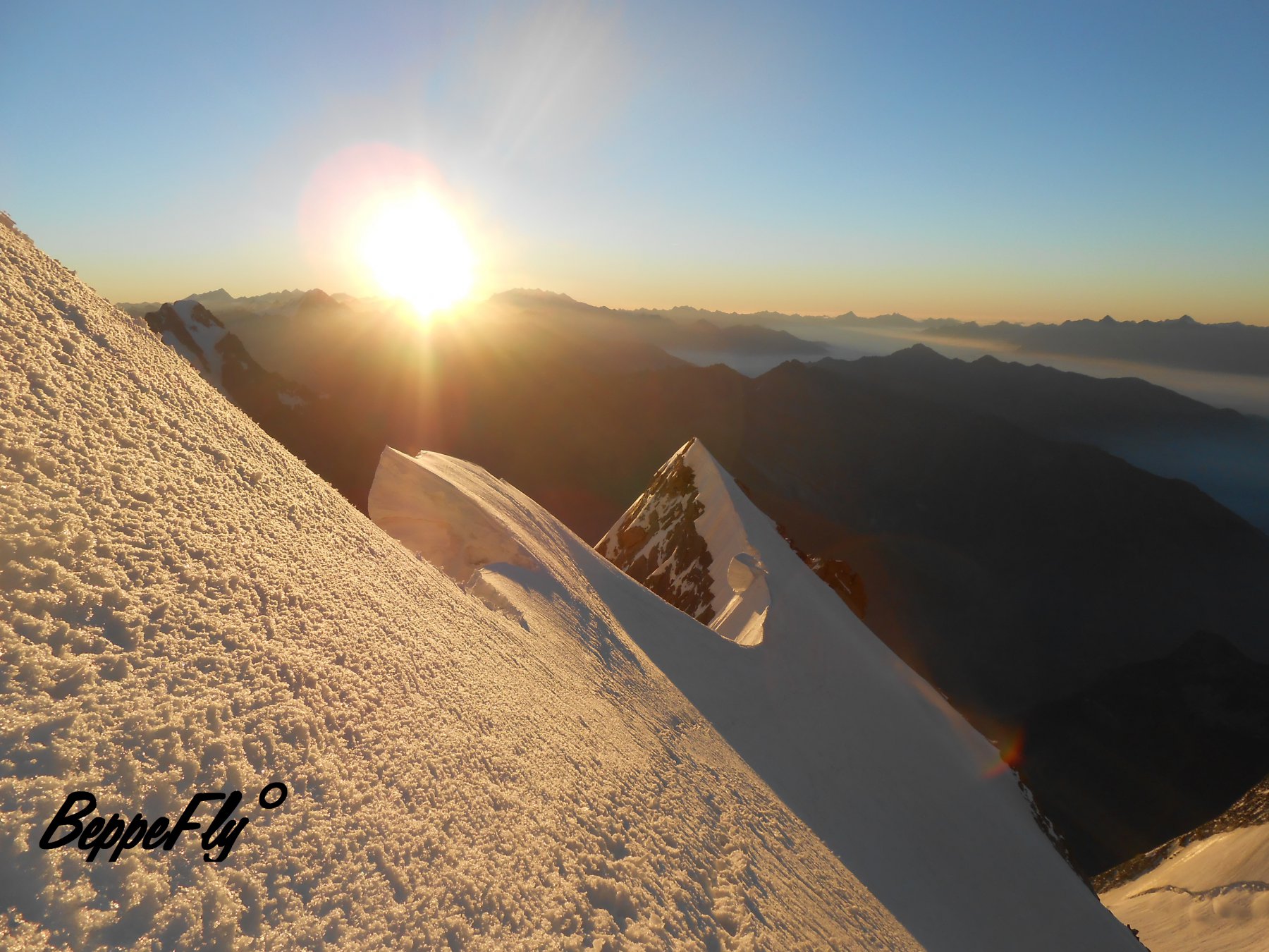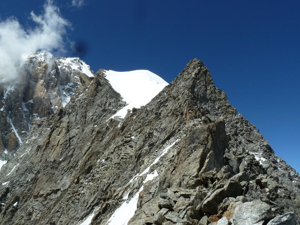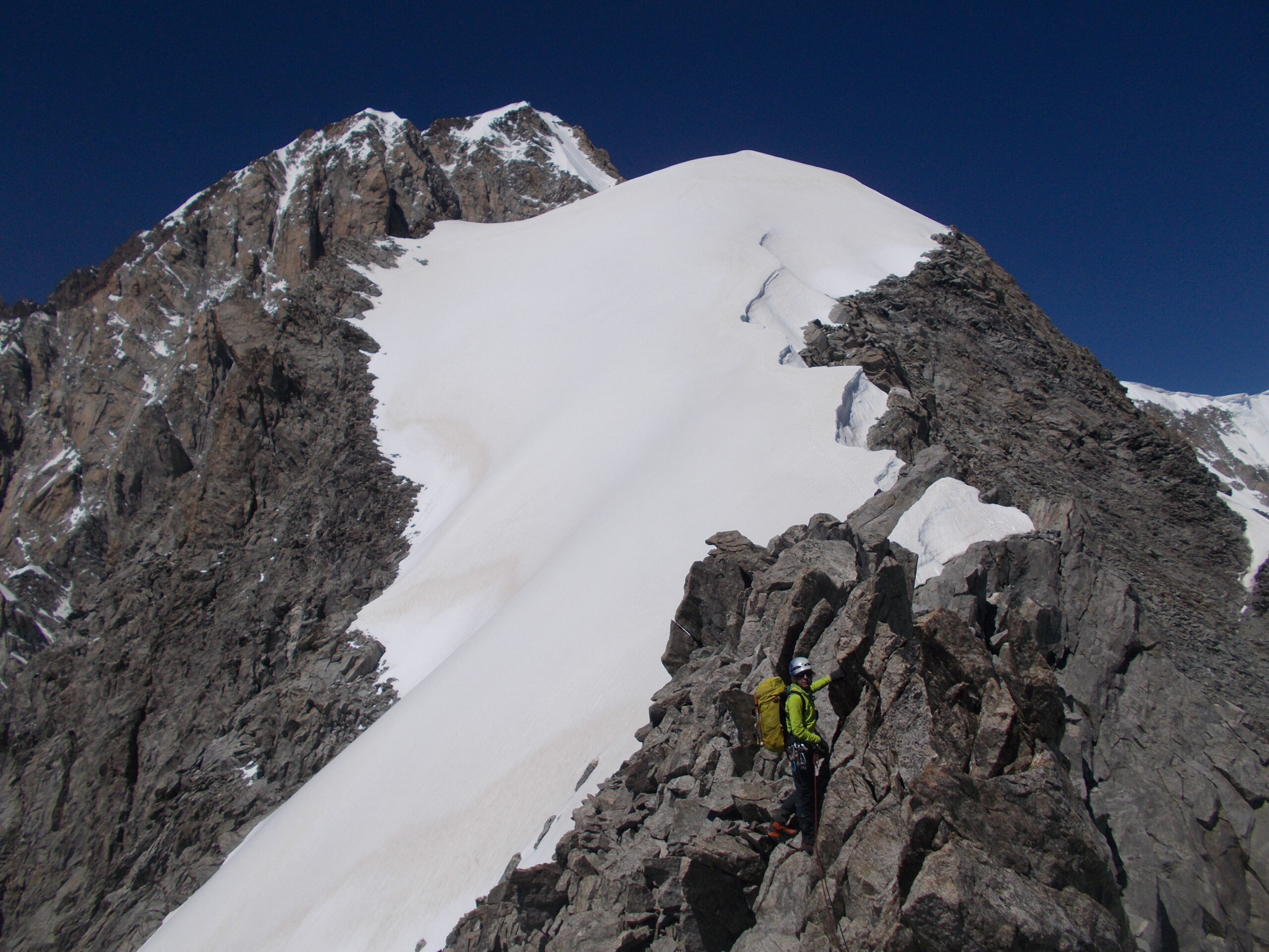 Si prosegue per detta cresta e si raggiunge la calotta glaciale dell’Aiguille Blanche (4114 m.). Dalla vetta SE si deve compiere la traversata dell’affilata cresta sommitale della Blanche, aggirando la punta centrale e giungendo sulla vetta NW.