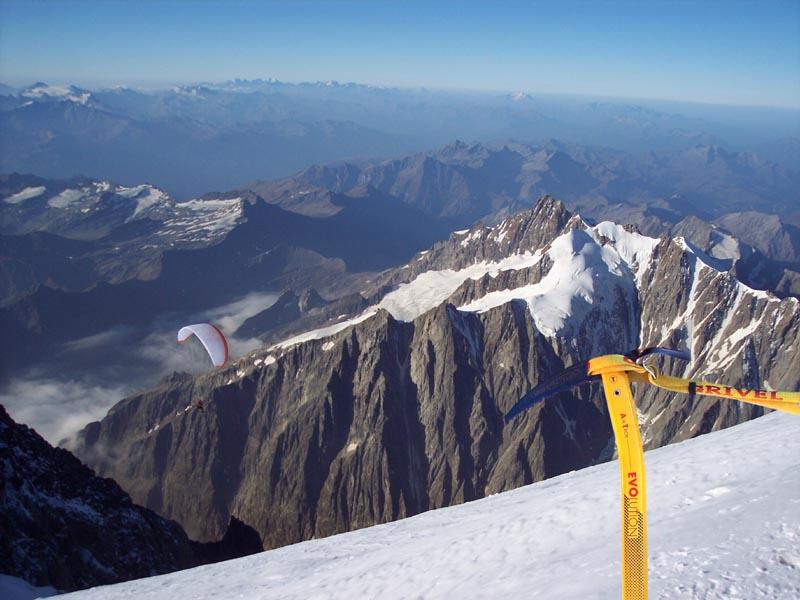 Restiamo in volo molto a lungo grazie alla dinamica sul costone Nord del Bianco. nonostante i 15mq dell’Ibex salgo, salgo, salgo !!! Foto all’aiguille du Midi con i ramponi ai piedi… mitica !
