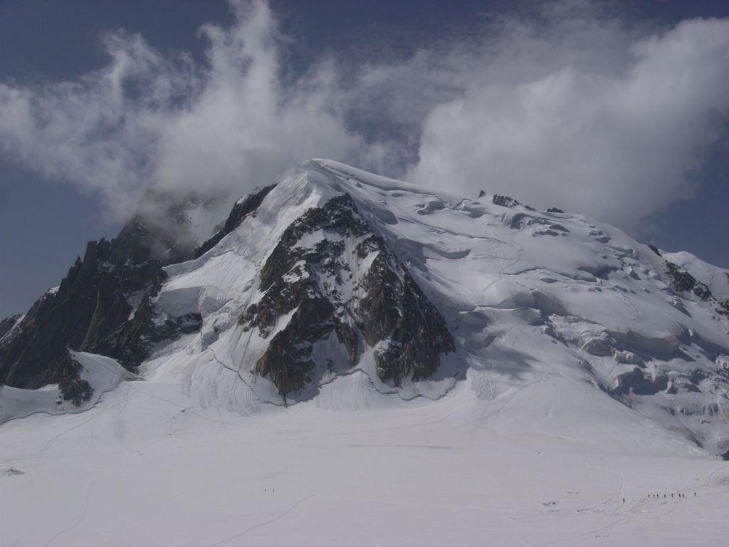 Da Col du Midi risalire la parete nord del mont Blanc du Tacul, alla spalla 4075 m. traversare in leggera discesa sino ad “agganciare” la parete nord del m. Maudit, risalirla sino al col du Mont Maudit 4345. Il tratto sotto il colle può essere in neve ma sovente è delicato con ghiaccio affiorante negli ultimi metri sopra la terminale, 50 metri a 50° di pendenza, meglio avere un pezzo di corda da 20-30 metri. Attraversare in leggera discesa verso il col de la Brenva m. 4309 e risalire i facili pendii nord-est per i Rocher Rouges sino in vetta al monte Bianco.