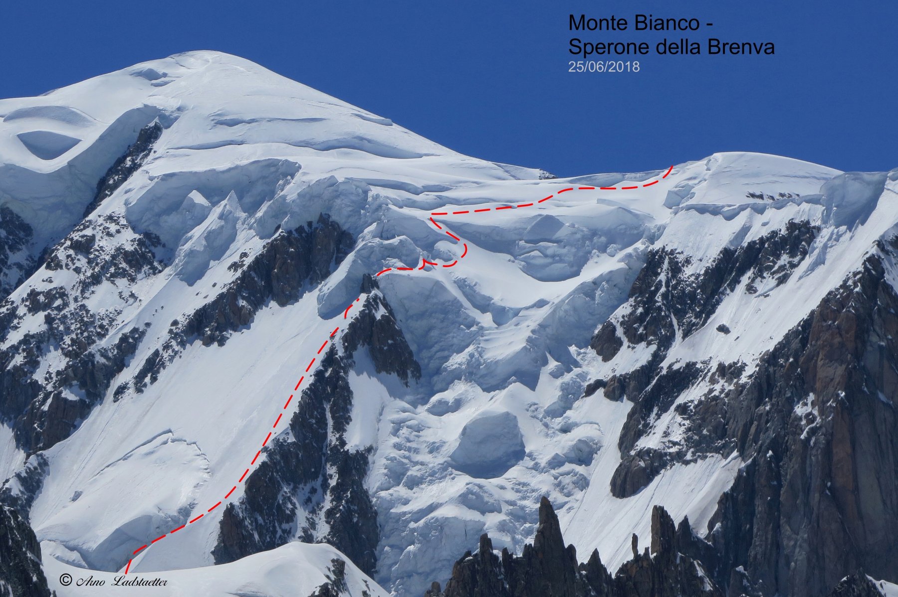 Superare il col Moore e scendere in diagonale discendente versante Brenva fino a reperire i pendii di neve che salgono. Tutto l’anfiteatro è chiuso da barre rocciose. Traversare lungamente in modo ascendente e talvolta orizzontale verso sinistra (salendo) fino ad arrivare ad un colletto evidente. Da qui seguire il filo dello sperone nevoso (con qualche passaggio di roccia facile) risalendo in direzione del filo di cresta dello sperone principale della Brenva. Una volta sul filo di cresta l’itinerario è evidente fino all’ultimo isolotto roccioso contro i seracchi. Al momento lo stato dei seracchi stessi permette di procedere in questo modo: aggirare il grosso isolotto a sinistra e salirvi a monte. Traversare in piano per circa 250 m verso destra per uscire al colle della Brenva.