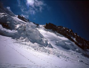 Via dei Tre Monti percorsa in discesa dopo l’ascensione al Monte Bianco per la via Ratti. Siamo scesi dal Col Maudit faccia a monte visto che con la corda di 30m non arrivavamo neanche a metà del pendio.