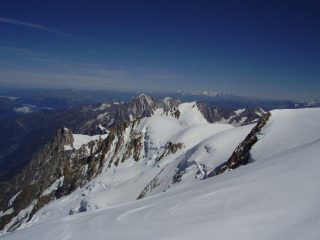 Salita bellissima in un ambiente fantastico. Arrivare alla spalla del mont Blanc du Tacul di notte è abbastanza impegnativo, così come l’ultimo pendio del mont Maudit: circa 50m assai ripidi, con possibilità di sostare a metà su roccia (cordoni in loco). Alla fine abbiamo trovato due fittoni di sosta. Abbiamo poi scelto di scendere dalla via normale del Gouter a causa di due persone che non stavano bene…arrivati al rif. de Tete Rousse siamo stati incolpati di essere scappati dal Rif. des Cosmiques senza aver pagato (avevamo lasciato là della roba ed un nostro amico!):questa è l’accoglienza pessima dei rifugi francesi!!!, senza parlare poi del rif. du Gouter, uno scandalo!!!