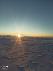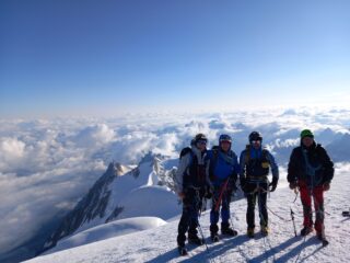 2⁰ giorno: sveglia ore 0,45. Colazione ore 1,00 partenza ore 1,40. Consiglio di avere un GPS con traccia in caso di nebbia,( questa su Gulliver è corretta ringrazio stefano-dondero) perché tra buio e nebbia è facile perdere l’orientamento e non si vedono le luci delle altre cordate. Quest’ ultime erano le nostre condizioni per i primi 200mt di salita. Purtroppo nessun cartello, paletto, segno ad indicare la direzione in uscita dal rifugio. Una volta individuata la traccia giusta non c’è piu possibilità d’errore. Salita che si svolge per 3/4 in notturna, come da relazione e su buona traccia, la creppacciata terminale del Mont Maudit è stata attrezzata con una corda fissa, 1/2 ora di coda su quest’ultima, il pendio seguente da risalire +/- 50⁰ ben scalinato, neve un po’ sfondosa una volta svalicato nel traverso del colle della Brenva sino al plateau terminale che conduce all’ultima salita verso la vetta.