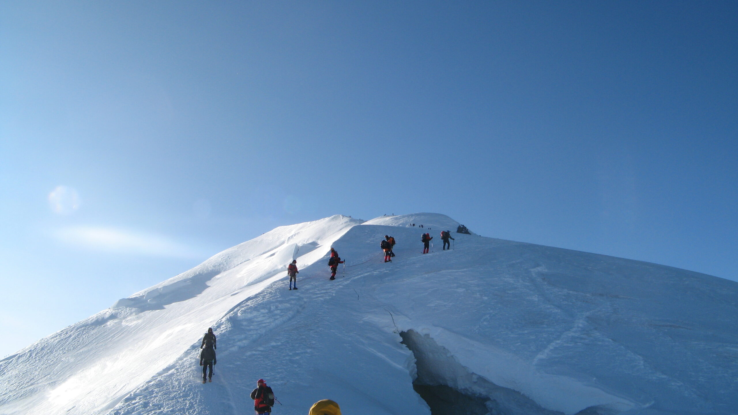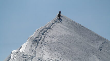 Salita effettuata partendo h.01.30 dal Ref. Tête Rousse ,dove abbiamo pernottato. Couloir del Goûter con non smentisce la fama, è partita una scarica ed un sasso ha preso di striscio lo zaino di un socio del gruppo. Usciti dal posto infame, saliamo le roccette attrezzate che portano al Ref. Goûter dove facciamo una sosta di quasi un’ora. Ripartiti ancora nel buio più totale, becchiamo le prime luci nei pressi del Dôme du Gouter . Da li, in breve, raggiungiamo il Ref.Vallot, dove l’altitudine incomincia a farsi sentire e come tanti facciamo sosta, anche per ricompattare il gruppo. L’interno del bivacco è per stomaci forti una vera e propria cloaca ,sporcizia, immondizia con odore di vomito che aleggia in aria, ma quando si è stanchi, oppure con meteo pessimo, ai particolari non si bada più, i canoni di finezza a queste quote saltano frantumandosi. Per molti l’interno della topaia posta strategicamente a 4362mt. può rivelarsi un’oasi felice, utile come nel nostro caso, per tirar fiato e riprendersi dal freddo e soprattutto dalla quota e in casi estremi con meteo infame anche per portare la pelle a casa. Dopo una sosta di mezzora ripartiamo dalla Vallot per gli ultimi quasi 500mt. affrontando il sinuoso tratto di cresta delle Bosses arrivando faticosamente sull’ultimo filo di cresta che si smorza sulla calotta sommitale, mettendo i piedi sulla cima più alta delle Alpi alle h.09.30 . Tirando le somme, percorso trovato in condizioni ottimali, come anche il meteo, che a queste altezze, fa la differenza. Mi a stupito il panorama, osservato dalla cima con giornata meteo favorevole. Con i suoi 4810mt. il M.Bianco sovrasta di gran lunga le vette attorno a se, che non rivaleggiano in altezza. La visuale panoramica risulta molto vasta, ma purtroppo molto schiacciata e un po’ deludente.