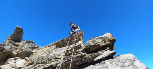 Percorso spettacolare. Facile fino a punta Battisti salita dalla via normale dove sono presenti catene nuove. Volevamo salire dalla attrezzata ma abbiamo mancato l’ attacco. La cresta di collegamento tra la Battisti e l’ uscita del canale Chiovenda , è a tratti delicata ma non difficile, una scaletta esposta di 4 metri permette di scendere un gradone un po’ difficile. Nessun problema poi fino in vetta al Pizzo Bianco, via ben segnata ad Ometti.