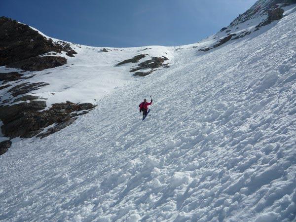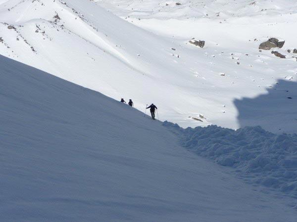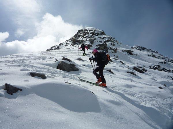 Partiti da Pecetto sci ai piedi, risalito le piste fino al Burchi, poi il canale del torrente fino alla Zamboni. Il ripido canale Chivenda era invaso da una grossa valanga, che in parte abbiamo dovuto attraversare nella parte alta. In salita neve dura. Sul camale abbiamo messo i rampant. Dal colletto, cambiando versante, neve molle già in salita.
