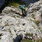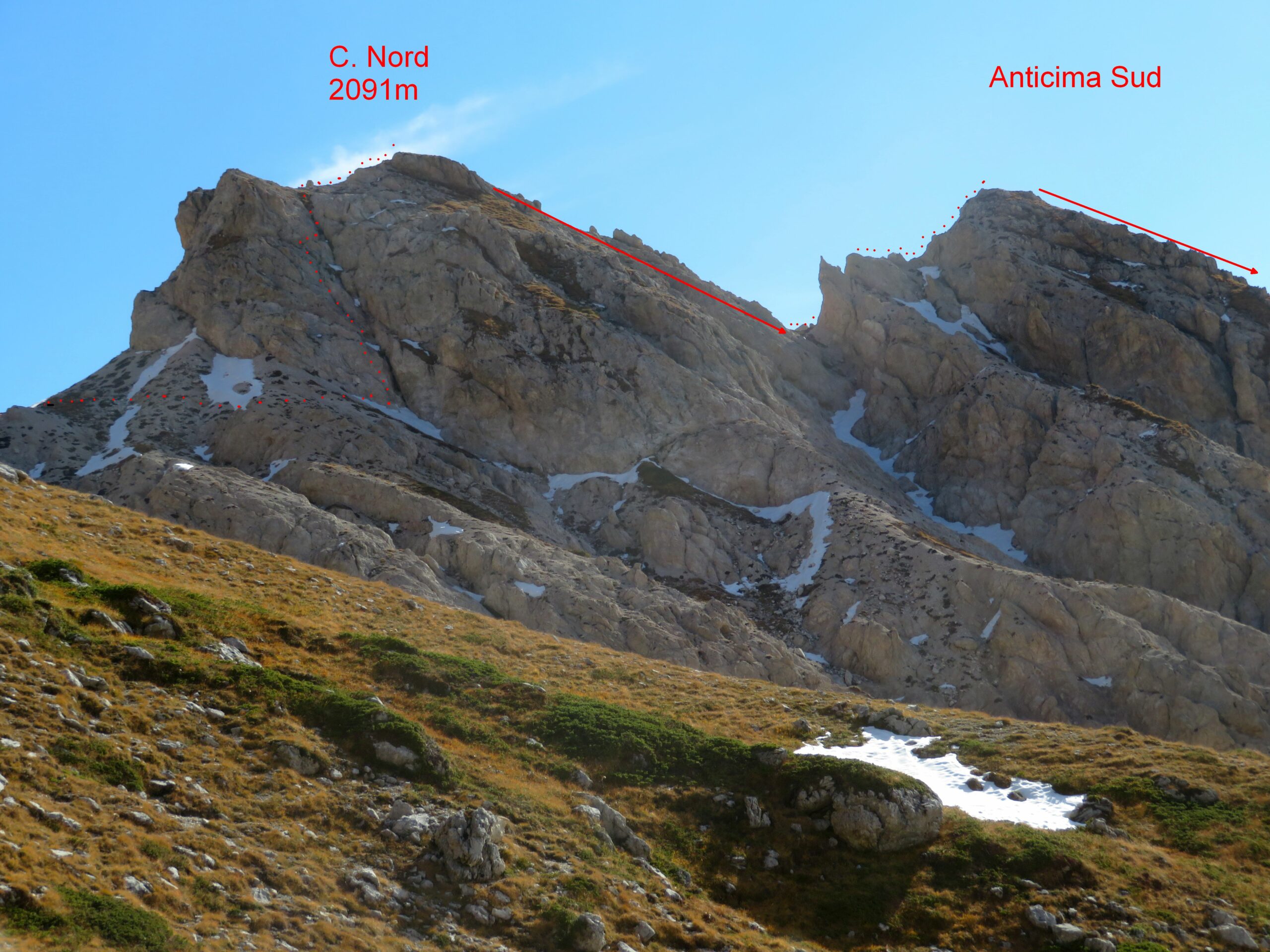 Si scende su terreno detritico ed instabile sulla dorsale Sud raggiungendo una selletta tra le due Cimette. Dalla sella si segue una cengetta verso sx e si conclude la salita all’AntiCima Sud m2080 molto più facilmente, su terreno detritico.