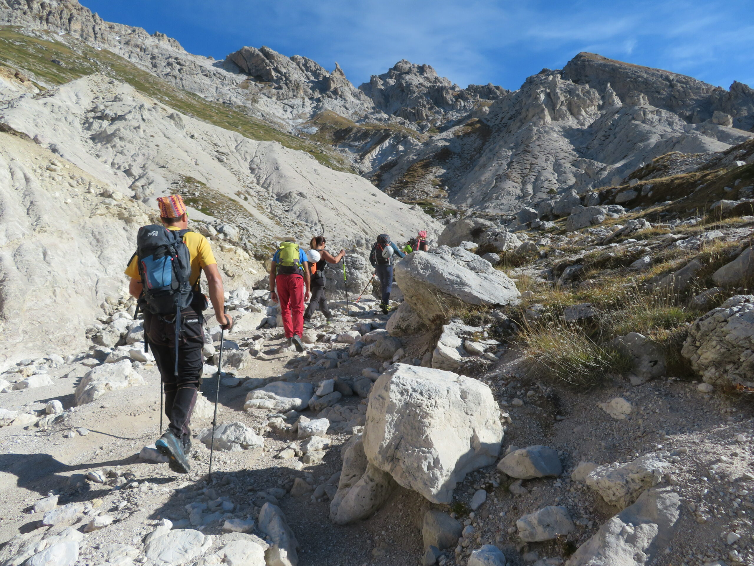 Si intercetta il sentierino (sbiaditi bollini giallo-rossi) della parte iniziale della Via Cai di Penne per poi proseguire dritti verso l’evidente Canalone di Santa Colomba per risalirne il primo tratto su terreno a tratti friabile, a tratti su grossi massi erratici, a tratti su ripide placche. Le difficoltà che si incontrano durante l’avvicinamento sono di carattere prettamente escursionistico.