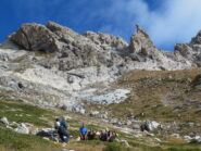 Raggiunta la base di una caratteristica ripida rampa erbosa ascendente a destra, si lascia il suddetto canale, e si traversa verso dx fino a portarsi su di una marcata e larga sella erbosa alle pendici della Cima Bifida.