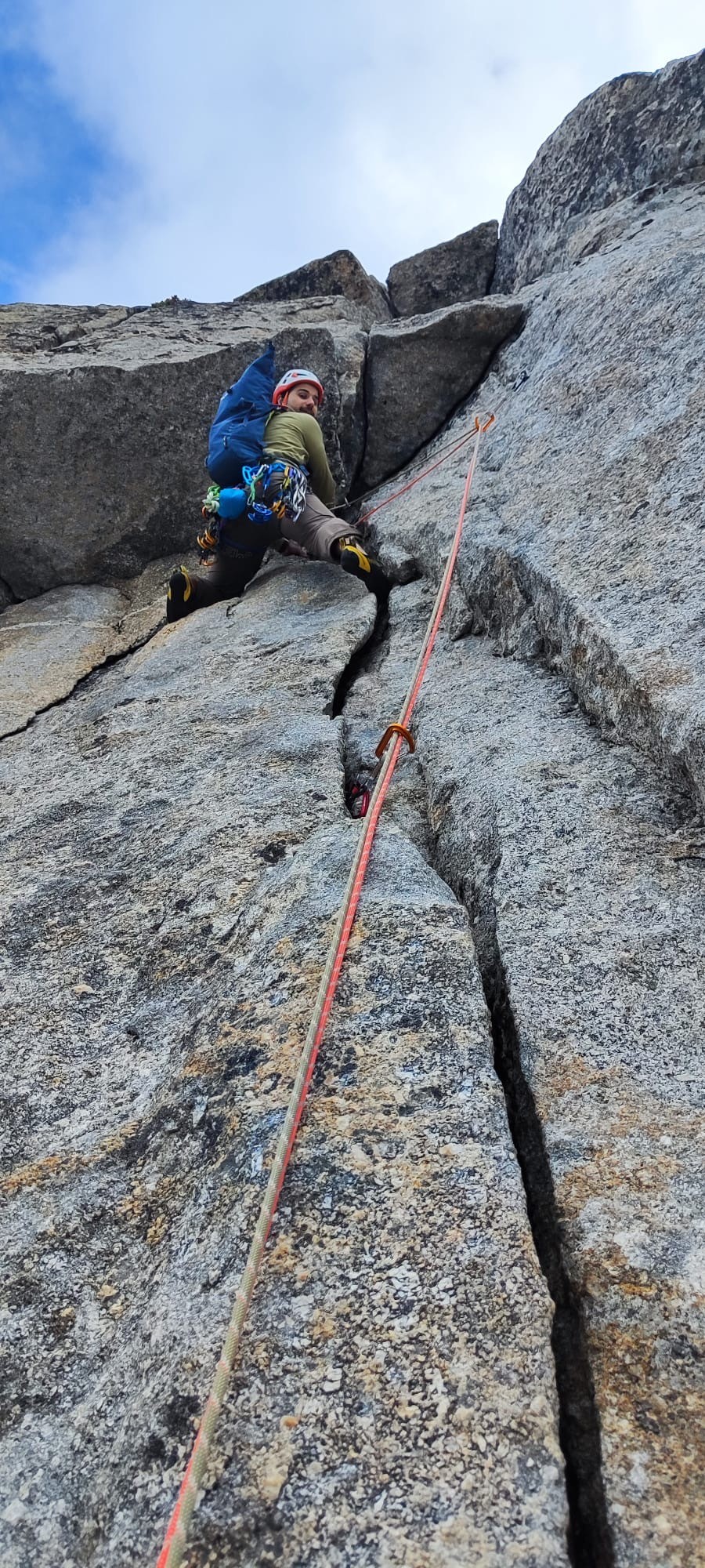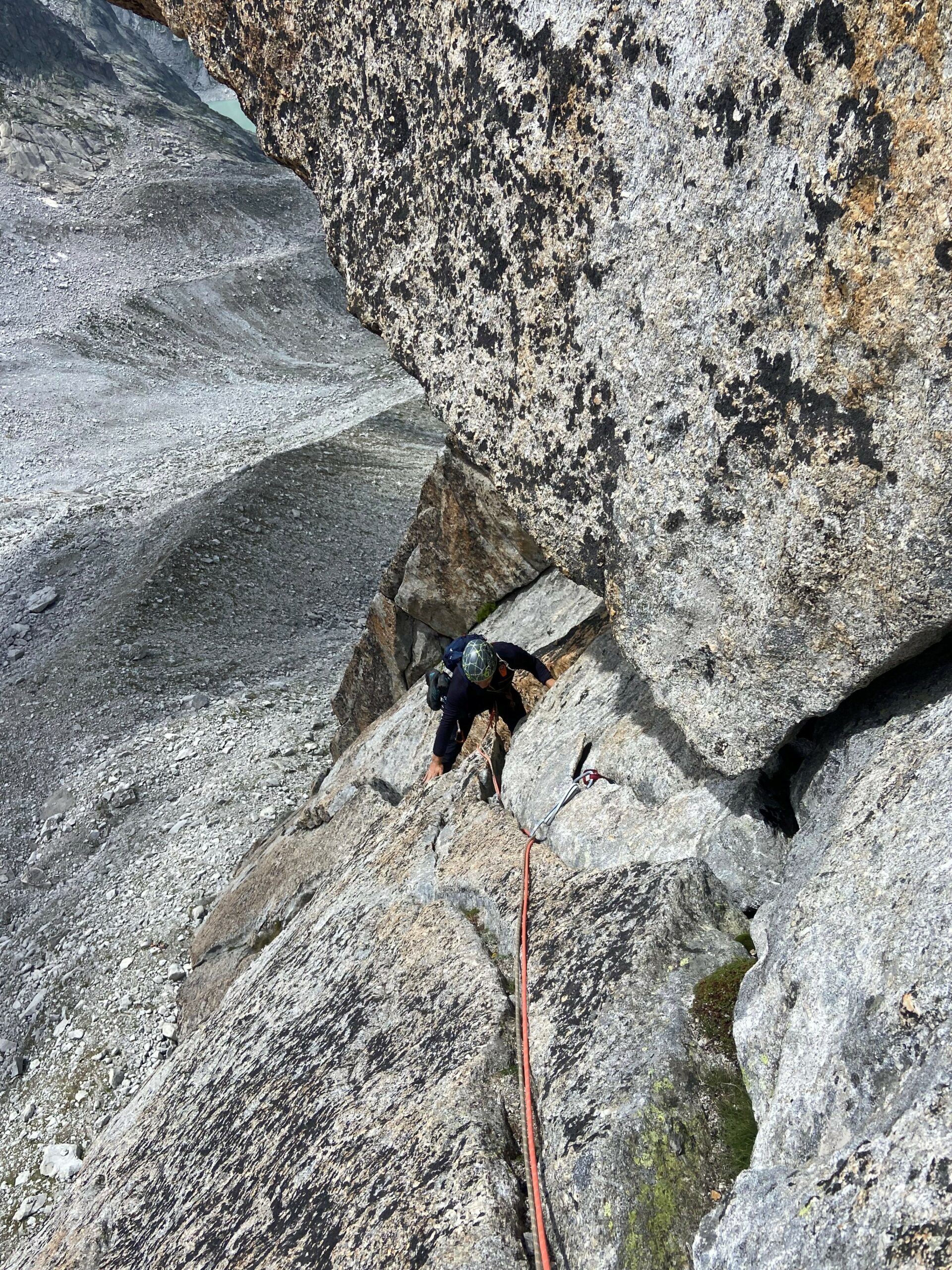 L6 salire il diedro e superare una lama strapiombante, IV-, 20m