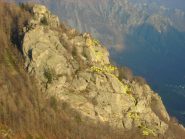 Salire i primi due tiri di “Prima linea”, di cui, il secondo, molto bello (max 5c). Sulla terrazza mediana salire la bella fessura del “Gruppo utopistico” 6a, poi raggiungere Roc Schiapà e salire “Guarda e impara”. Quest’ultima presenta un attacoo diretto molto fisico e insidioso 6a+