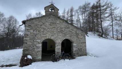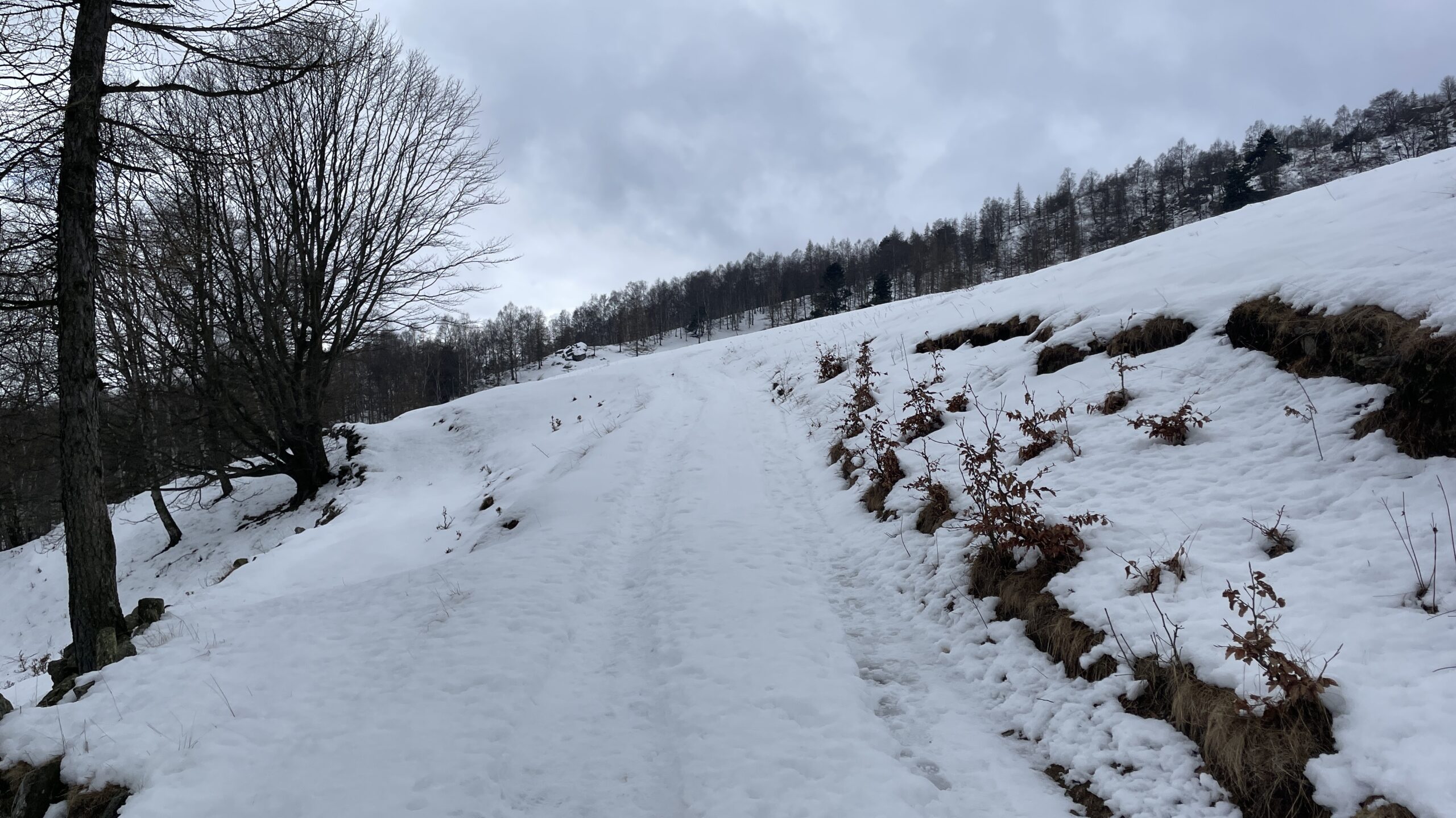 Da qui inizia la prima neve che diventa sempre di più ma è comunque percorribile un po spingendo e un po pedalando. La strada è abbastanza batutta grazie alle macchine che salgono.