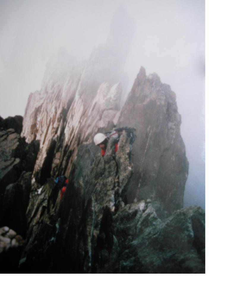 Volevo tornare a compiere una solitaria di ampio respiro, e cosi ho stabilito che per mettere a segno il mio progetto, l’Aig. de Bionassay poteva fare al caso. Percorso il chilometrico ghiacciaio del Miage per intero, da La Visaille al rifugio Durier poco al di la’ del confine Francese. Constatato la presenza del gestore (pensavo fosse incustodito!) e di alpinisti tutti Francesi, io ero l’unico Italiano quel giorno. Mi ci sono occorse ben 6.30h di marcia per coprire i 10km, (tanta e’ l’estensione del Miage) nel senso della lunghezza. Nella parte finale del percorso dove il ghiacciaio s’impenna a formare una barriera e’ stato inevitabile l’uso dei ramponi per superare l’ostacolo. L’indomani la prima parte della cresta alla Bionassay non opponeva ostacoli di rilievo. Ma ben presto mi trovo a dover compiere uno sforzo di volonta’per superare un verticale salto roccioso di una 60a di mt. che mi ha messo a dura prova. Forse non sara’stato nemmeno 3° ma va detto che ero slegato, mentre tutti gli altri invece giostravano con le corde. Meglio al di sopra del salto ormai solo piu’una crestina di neve fino in vetta. Affrontato la discesa nello stesso modo di come l’avevo salita, cioe’ disarrampicando cercando di non commettere il ben che minimo errore.