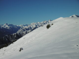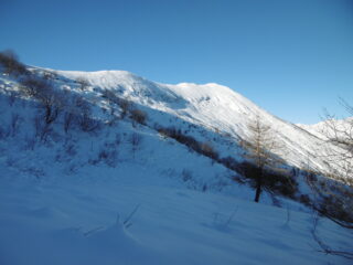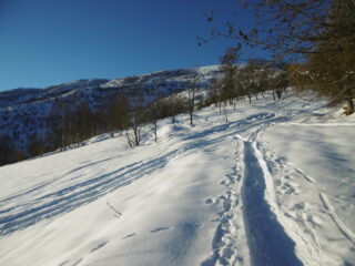 la prima della stagione , una gita dal sapore invernale , percorrendo dapprima la stradina ben tracciata e poi i pendii superiori verso il colle di melle ; da subito eravamo in due , poi in punta arrivava tanta gente ; una bella sciata dal colle in giu , su farina leggera tenendomi il piu possibile in ombra , ma serve altra neve sopra questo primo fondo