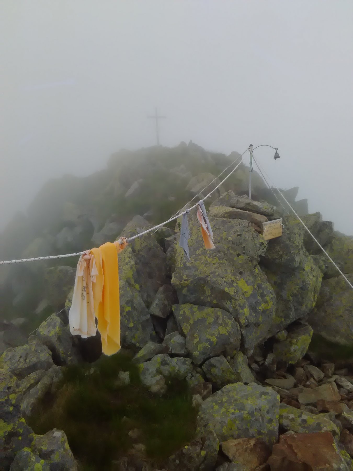 Salita facile tutto ben segnato da tacche nuove fino alla sella poi la traccia di accesso alla cresta si perde leggermente nella vegetazione ma e’ comunque intuibile, usciti allo scoperto la cresta e a vista fino in cima e molti omini danno la direzione giusta, molto utili oggi causa nebbia nel tratto tra la cima nord e la cima principale, discesa dalla normale.