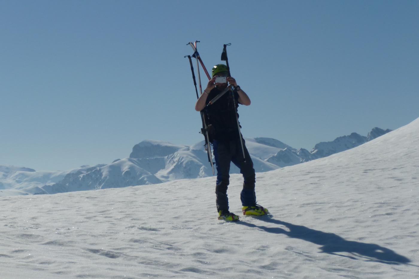 L’ultima neve caduta non ha avuto il tempo di trasformarsi ed ha poca coesione con lo strato sottostante. Innevamento ancora abbondante.Usati i ramponi nell’ultima parte.