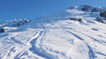 Traccia autostradale, ripida nella parte finale. Scesi dal primo canale a sx (faccia a valle), neve un pò pesante causa sole poi bella polvere fino alla stradina, pochi spazi ancora vergini. Innevamento buono, toccato solo una volta poco sotto la vetta.