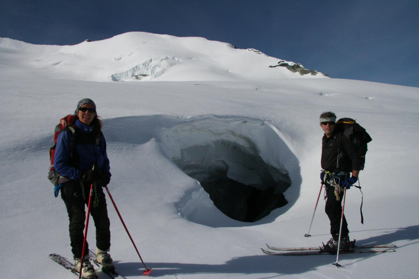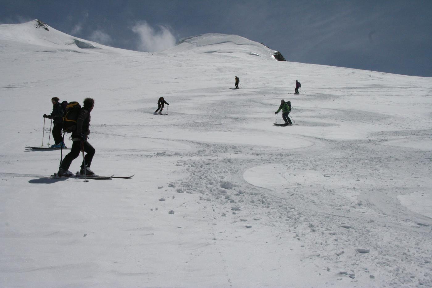 Da qui si rimettono le pelli e si sale fino in vetta senza particolari difficoltà, aggirando la seraccata e passando al largo della Tracuithutte.