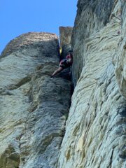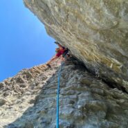 Stupenda via classica! Diedro strapiombante lungo e duro, spittatura 5/6 mt possibile integrare con friend su belle fessure nette!