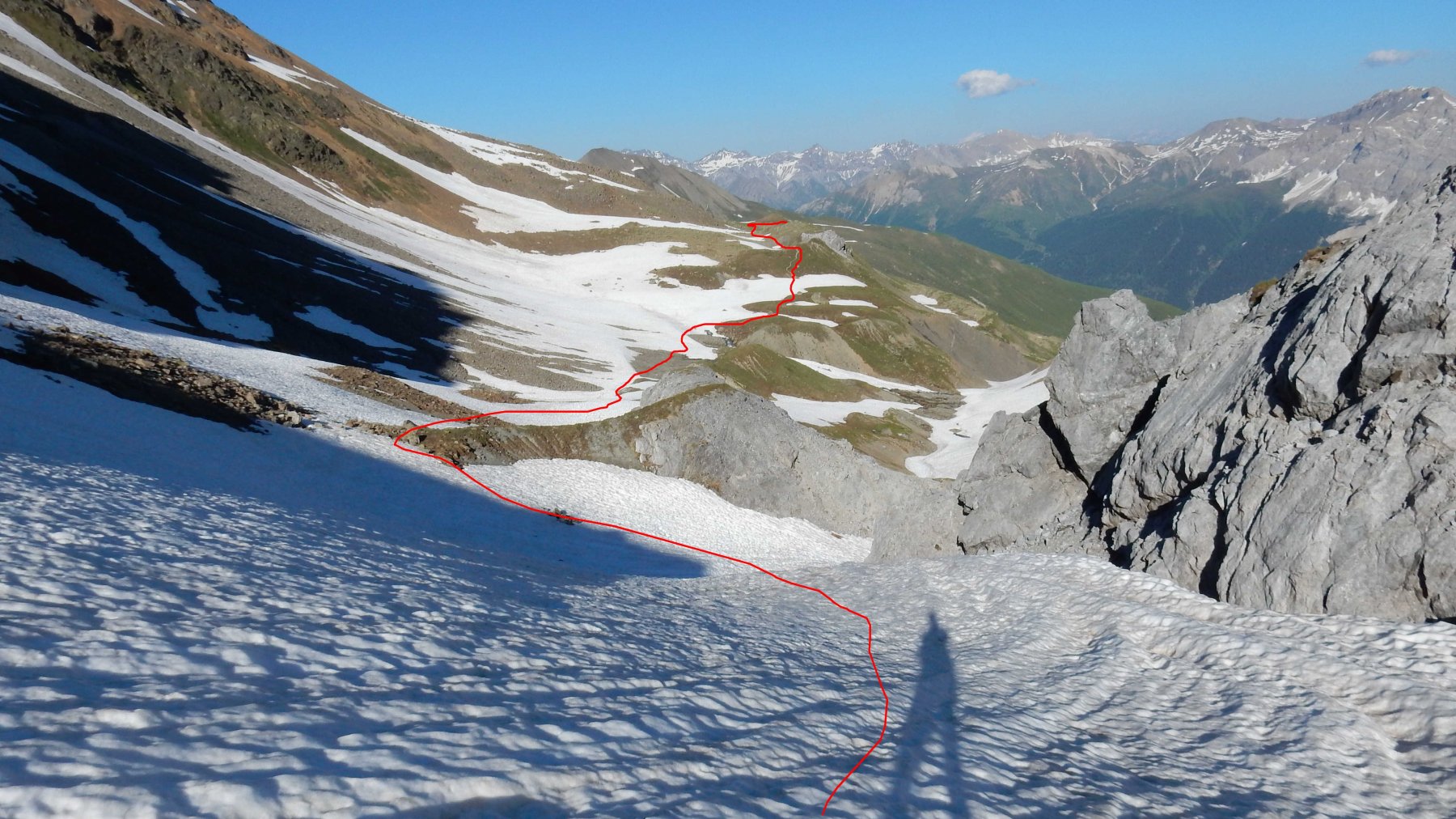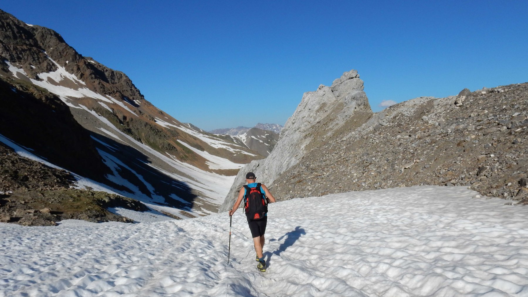 Poco prima del rifugio si prende la deviazione per la Fuorcla Pischa, seguendo sempre le strisce bianco azzurre si sale traversando in direzione ovest sotto il Piz Cotschen arrivando alla Fuorcla Pischa 2867mt.