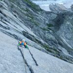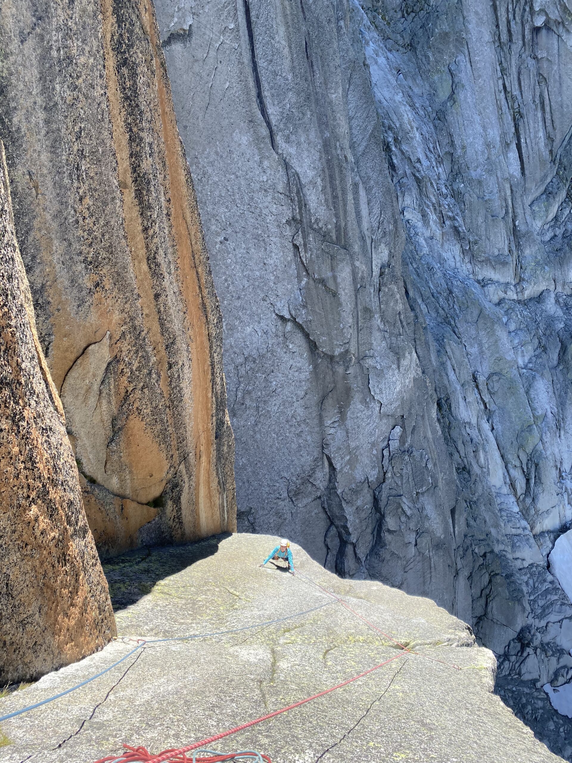 Il quarto tiro supera il lato sx di un gigantesco diedro con splendida arrampicata di placca.