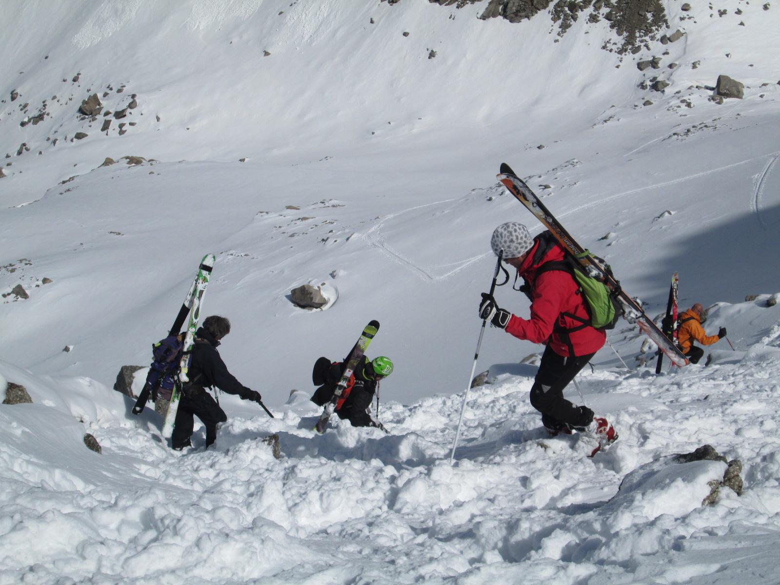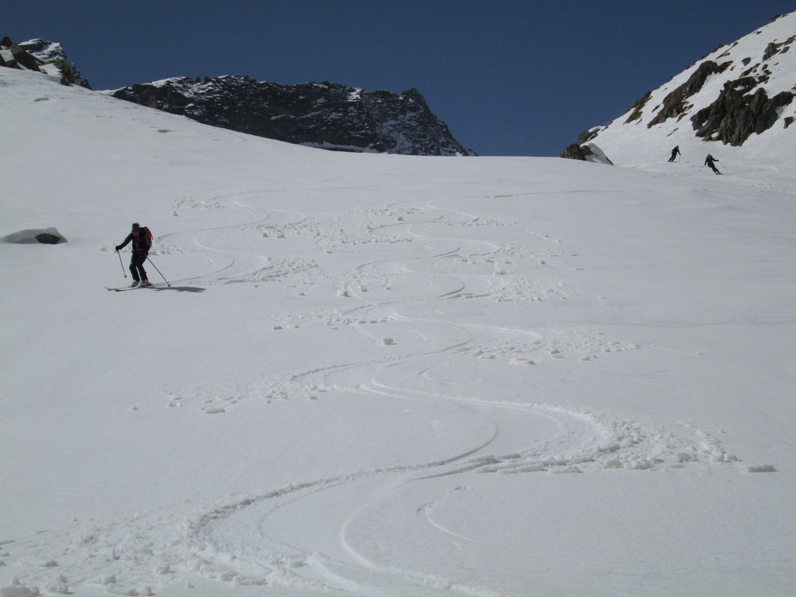 Partenza sabato alle 6.45 con 20 partecipanti, buon rigelo notturno e salita agevole e senza difficoltà fino al Colle dei Becchi, dove qualcuno si è fermato. Noi abbiamo proseguito per raggiungere la cima; dal colle in su nessuna traccia e neve quasi farinosa da tracciare, si sale bene fino a 50 metri dall’uscita in cresta, dove c’è un tratto piuttosto ostico a causa della poca neve inconsistente e delle tante pietre che rendono davvero faticosa la salita, e ci hanno fatto perdere molto tempo. Dall’uscita in cresta la cima si raggiunge facilmente in pochi minuti sci ai piedi. Panorama spettacolare e temperatura piacevolissima, si stava benissimo!!! Discesa iniziata intorno alle 11.30, crosta portante sulla dorsale, quindi il tratto ostico l’abbiamo sceso a piedi per evitare di distruggere gli sci. Da lì in giù bella farina pressata fino al colle, e quindi splendida primaverile fino al rifugio. Avendo perso quasi 1 h tra salita e discesa per superare il tratto ostico, siamo scesi forse un po’ tardi, ma il canalone di discesa consente di scegliere praticamente 3 esposizioni e quindi la neve bella si trova comunque…nella parte alta ci siamo tenuti sulla sinistra sui pendii più esposti a Sud perfettamente trasformati, in basso ci siamo spostati sul versante opposto dove la neve non era ancora sfondosa. Gita splendida e sciata spettacolare…fossimo scesi un po’ prima sarebbe stata da 5 stelle.