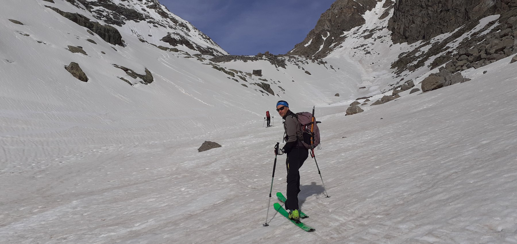 Si portano gli sci a spalla per un bel po’. Come ha scritto Rok1976 non bisogna prendere il sentiero estivo ma tenersi piu a destra verso il.torrente dove c’è neve continua da quota 2.250. Noi invece ci siamo fatto 530 metri e quasi due ore di portage. Fino al colle i rampant non sono necessari mentre per salire al Blanc Giuir abbiamo utilizzato nell’ordine rampant e poi ramponi e piccozza sul pendio finale molto sostenuto. Panorama favoloso dalla vetta, con il Becco Meridionale della Tribolazione a dominare la scena. Discesa dalla punta iniziata alle ore 11 su firn eccezionale fino al colle dei Becchi, poi neve piu pesante ma comunque sciabilissima…fino a dove c’è. Il pianoro del rifugio Pontese, chiuso, è del tutto sgombro. Con Daniela, Vincenzo e Riccardo.